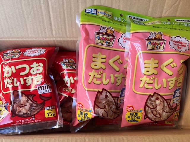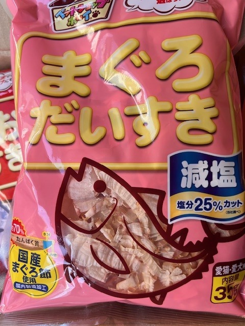 | * 商品説明 * 高タンパクな国産かつお節/まぐろ節を丁寧に削ってあります。 ●かつおだいすき ミニ 15g入り×9袋 賞味期限2026.01月末 ●まぐろだいすき 塩分25%カットタイプ 35g入り×2袋 賞味期限2026.06月末 ※商品重量約320g ※軽量ですが嵩張ります※ 未使用新品です。 在庫処分品とご理解の上ノークレームノーリターンでお願いします。 | ||||||||