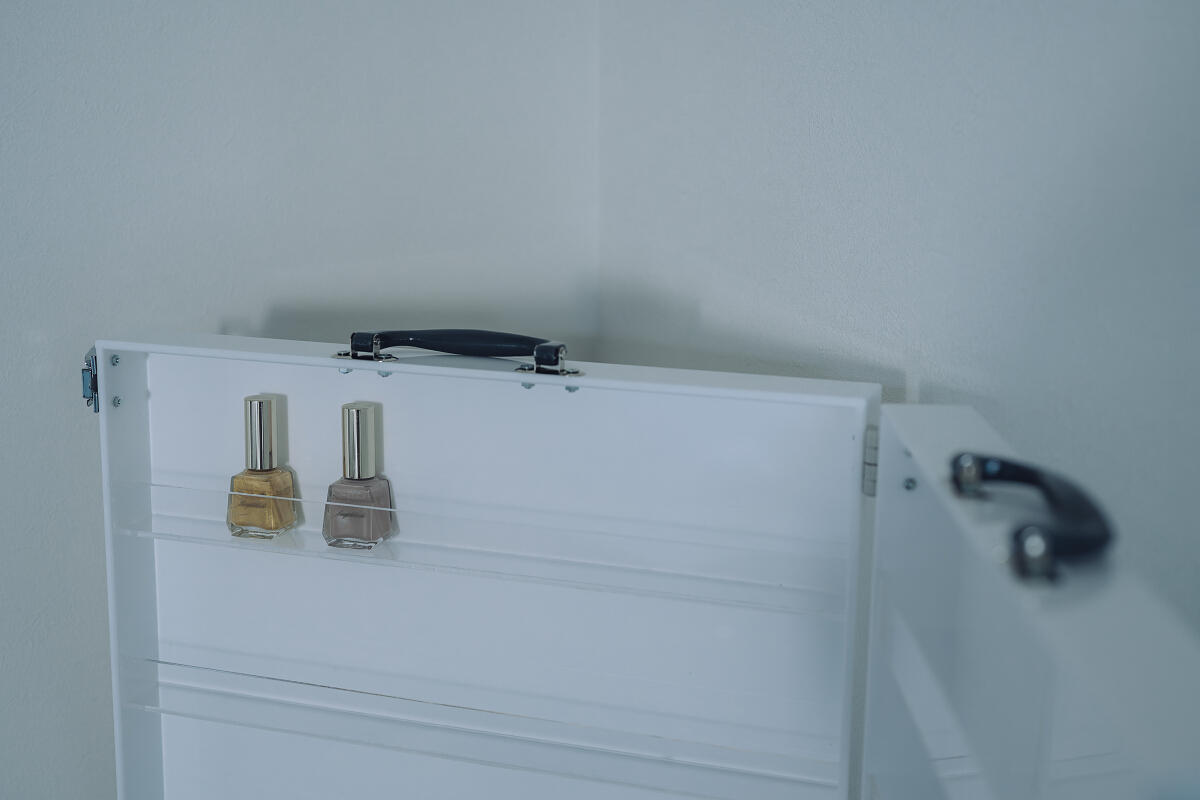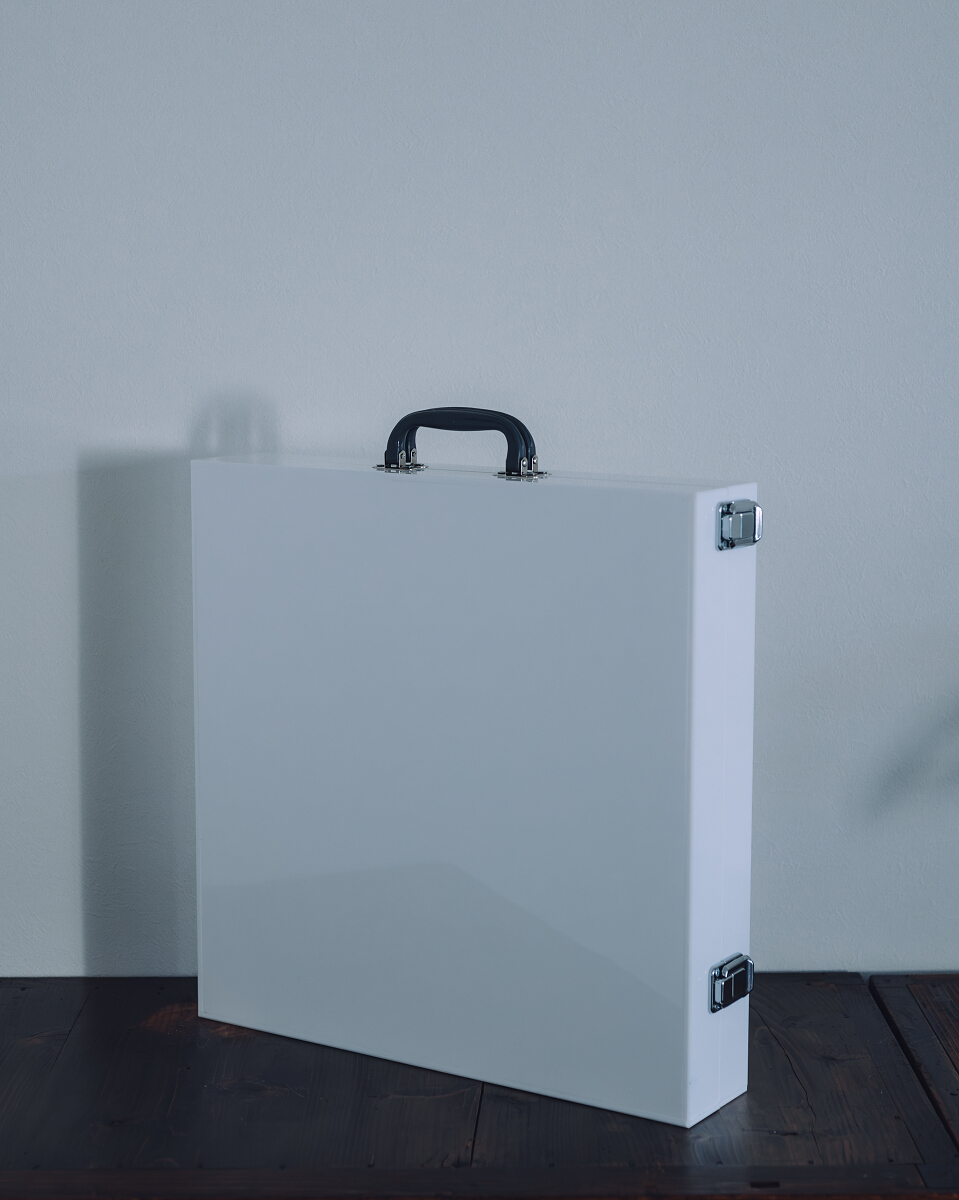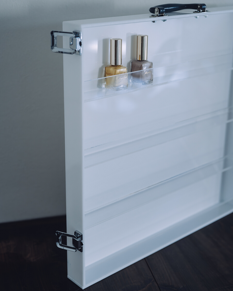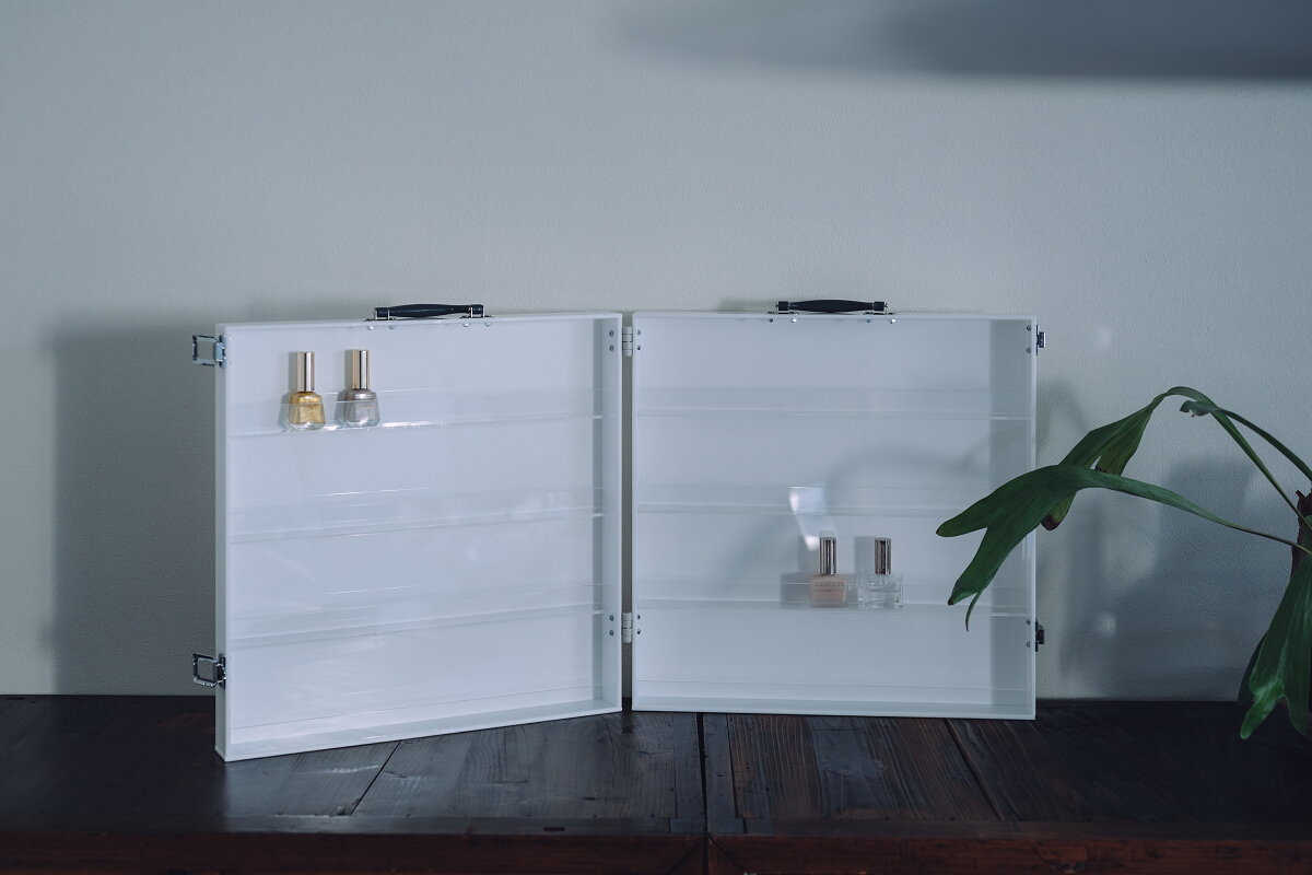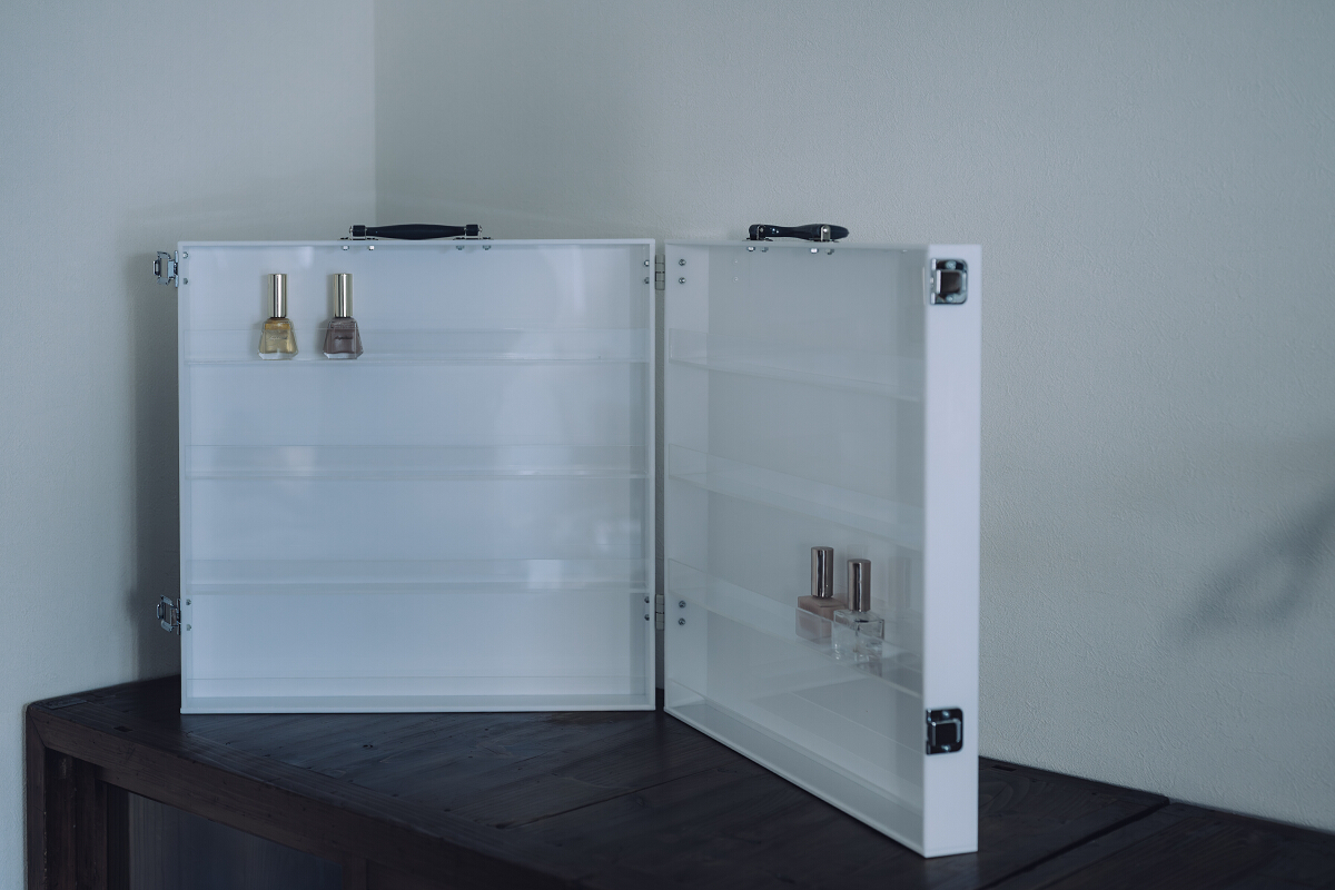 | オーラソーマボトルキャリングケース(2台1組) オーラソーマボトル50ml(イクイリブリアム)を128本収納可能なキャリングケースです。 1台につき64本収納×2台=合計:128本収納。 ディスプレイ形態⇔キャリング形態 ディスプレイ形態:ケースを開くことによりボトルを美しく見せる展開状態にすることが可能。 キャリング形態:ケースを閉じることにより持ち運び&ボトル保管状態にすることが可能。 国内生産の高品質アクリル製 高品質な国内生産のアクリルホワイトを全面に使用しております。ケース内の棚部分(こぼれ止め) には透明度の高いクリアアクリルを使用。 仕様 ケース本体:アクリル乳白色 棚板&こぼれ止:アクリルクリア パチン錠(2個) 樹脂製蝶番(2個) 取っ手:ダークグレー 【キャリング形態】 横幅:426mm 奥行:72mm 高さ:419mm 【ディスプレイ形態】 横幅:862mm 奥行:36mm 高さ:419mm 【1列の内寸】 横幅:416mm 奥行:31mm 高さ:100mm 製作 有限会社 大手工房 https://www.ohtekobo.co.jp/ |
