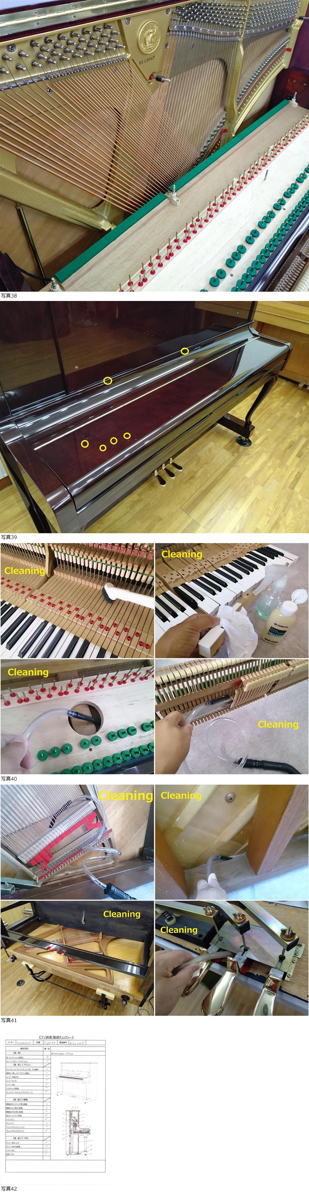 | ◆内部機能の調整(整調作業)は各項目にわたりチェックし、必要な調整作業を施しています。画像42【調律/整調チェックシート】参照 ◆外装は各部品を分解して個々に研磨美装し組み上げているのできれいに仕上がっています。 ◆内部・裏側は専用器具で丁寧にクリーニングをしました。特に鍵盤はお子様がお使いになることを想定し、念入りに3回の作業工程(除菌含む)で仕上げています。画像40.41 (Cleaning画像はイメージです同等の作業を行っています) お越しいただいた方にいつでも試弾していただけるよう調律をしていますが、運搬時の振動による影響も考えられますので、搬入後に状態をみて落札者様で実施されることをお勧めします。ピアノは内・外装とも丁寧にチェックして出荷いたします。 | ||