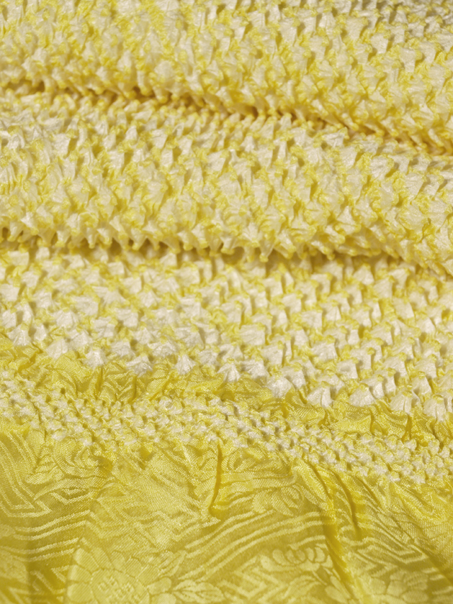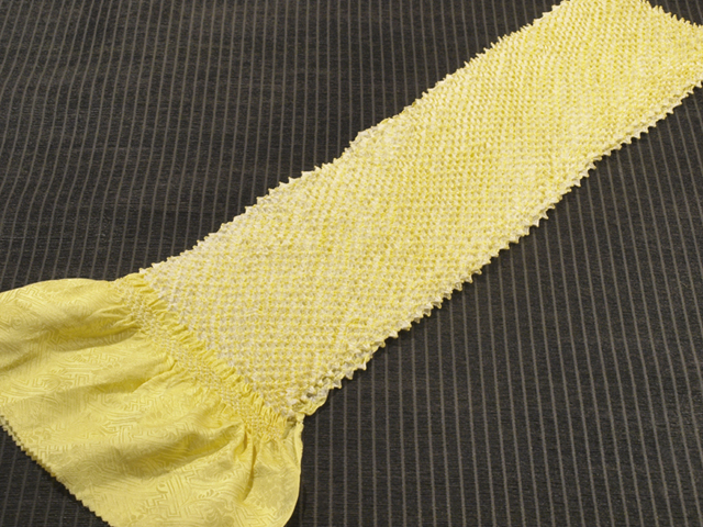 淡めの中黄色の地に、本紋(紗綾形に花)の地紋が織り出され、鹿子(かのこ)の総絞り染めが施されている綸子の帯揚げです。 ユーズド品としてはいますが、使用感は感じられません。目につくしみやよごれ、褪色などのダメージはなく、とてもきれいな状態です。 |