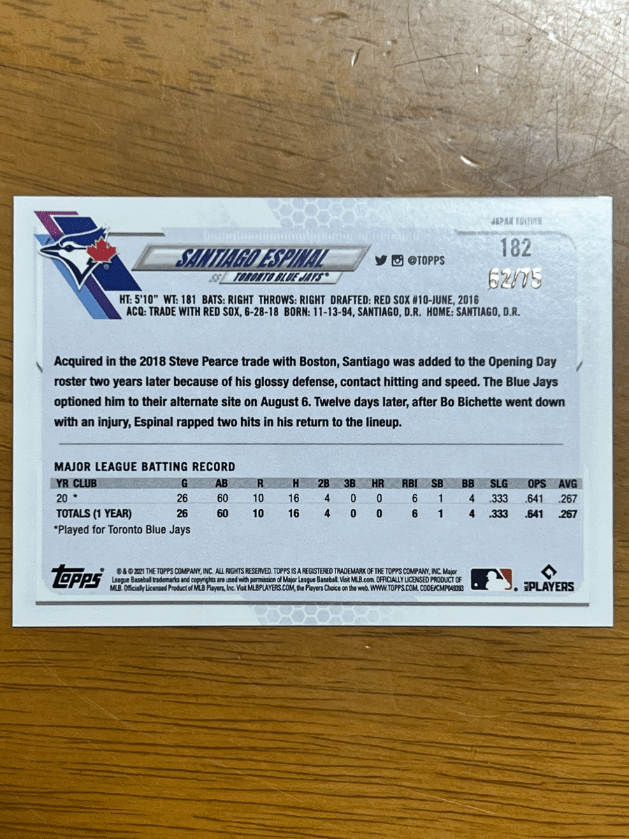 2021 Topps Japan Edition サンティアゴ・エスピナル Santiago Espinal Green Parallel /75 #112 RC