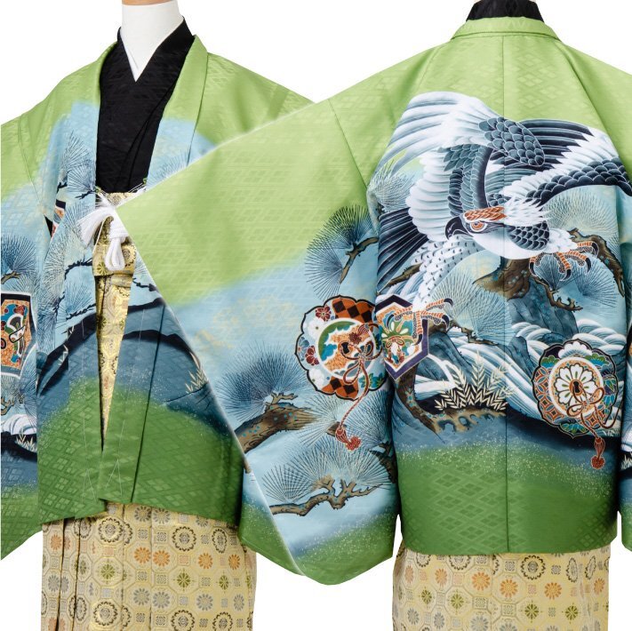 | 着物サイズ | 【着物サイズ】 着物身丈:約 100cm 着物裄丈:約 53cm 着物袖丈:約 56cm 羽織身丈:約 65cm 【袴サイズ】 袴紐下:60cm(適応身長 約100~112cm) 【雪駄】 約 19.5cm |