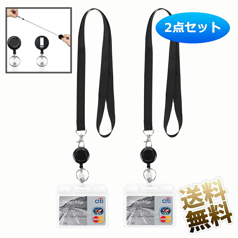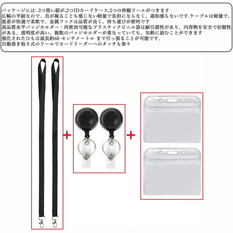 パッケージには2つ黒い紐、2つIDカードケース、2つの伸縮リールがつきます。