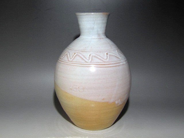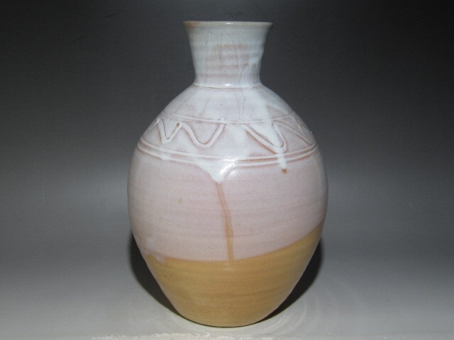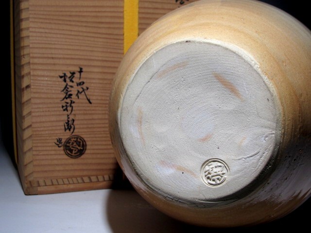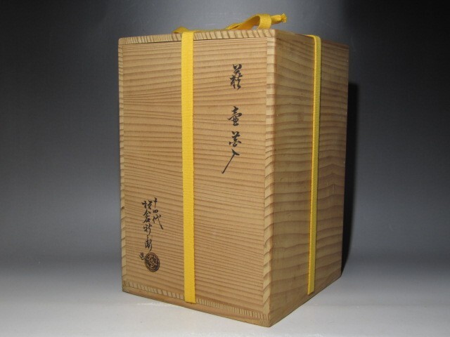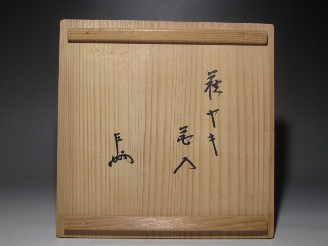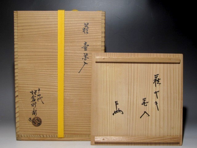 十四代坂倉新兵衛作の萩壷花入です。 柔らかで温かみのある雰囲気の見事な出来栄えの作品です。 箱蓋裏に表千家十三代即中斎の花押があります。 【十四代坂倉新兵衛(さかくら-しんべえ) 1917-1975】 昭和時代後期の陶芸家。 12代坂倉新兵衛の3男。長兄(13代追贈)の戦死で家業につき,昭和35年父の死で14代をつぐ。 日本現代陶芸展や日本伝統工芸展などに入選。 47年山口県指定無形文化財保持者となった。 サイズ 直径17cm/高さ24cm(多少の誤差はお許しください) 状態 一見して疵やヒビ・直しは見られません。 骨董品という事をご勘案頂き、時代経過のスレや、小さな傷がある場合があるかもしれませんのでご承知置きください。 | |||