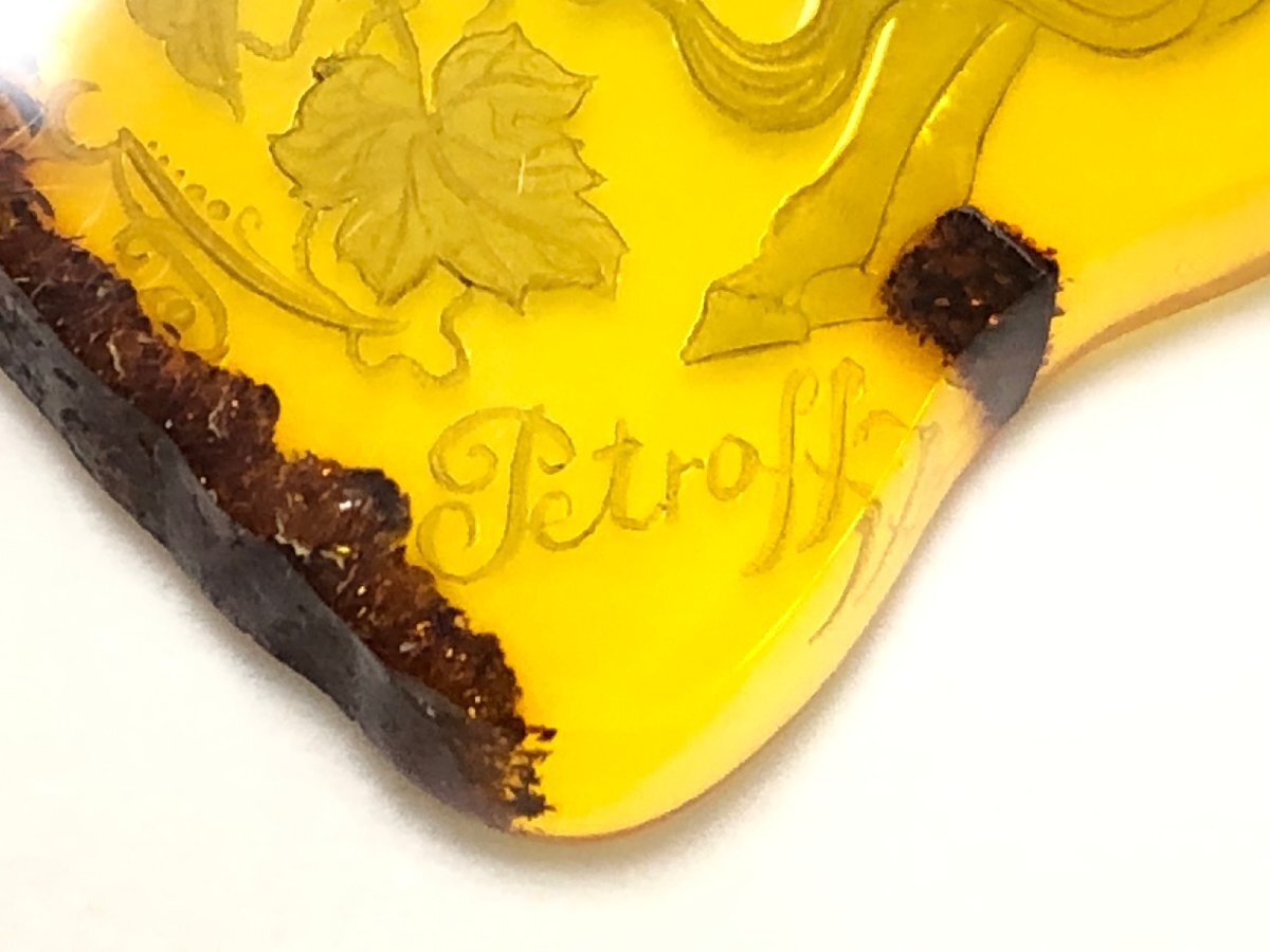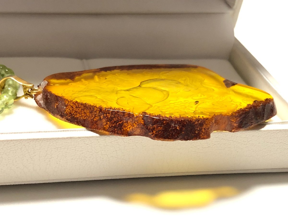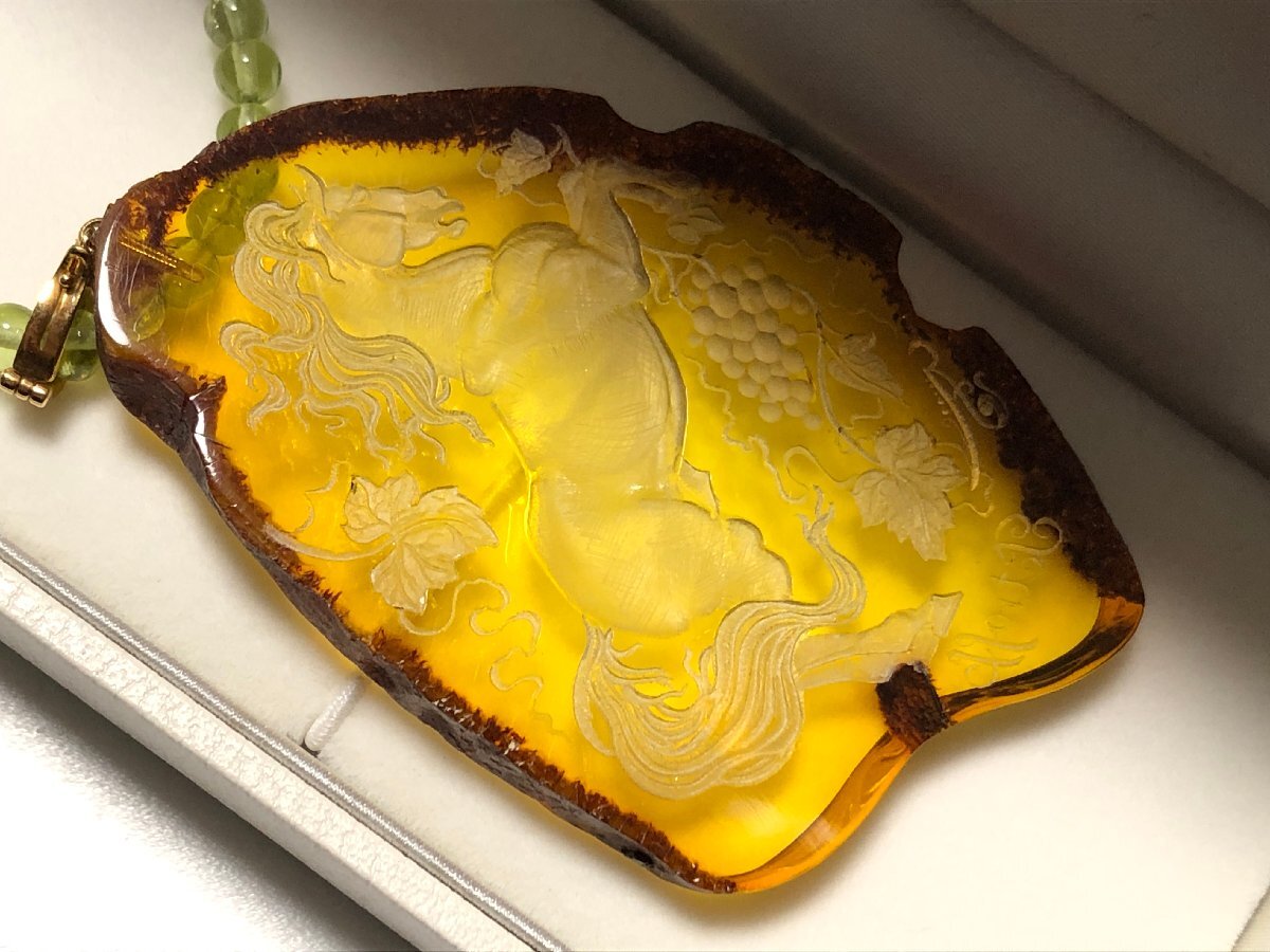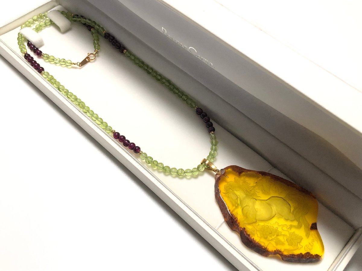 ロシア宮廷芸術家Petroff(ペトロフ)の本琥珀、ペリドット、アメジスト、K18を使用し、インタリオ(沈み彫り)で馬細工を施した、デザインペンダントネックレスです。ペンダントトップ、チェーンの金具部分にはK18の刻印があります。美品、ケース付属です。| 出价者 | 信用 | 价格 | 时间 |