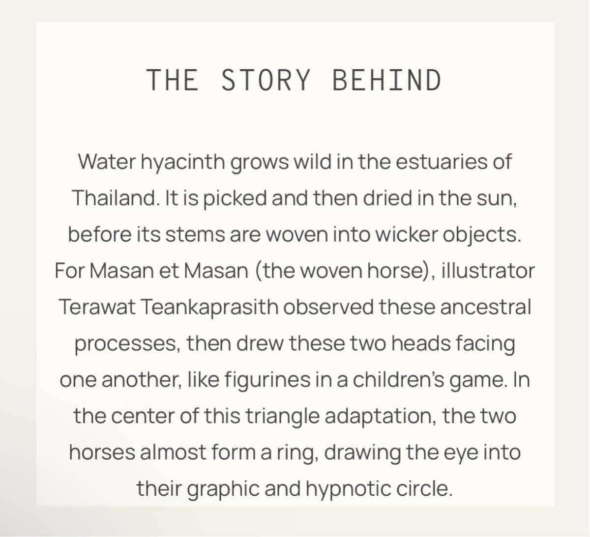 陶芸品の籐編みをイメージに、エルメスを象徴する2頭の馬が子供用の人形のように向かい合わせにデフォルメされたアーティスティックなデザインです。
