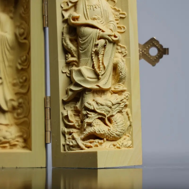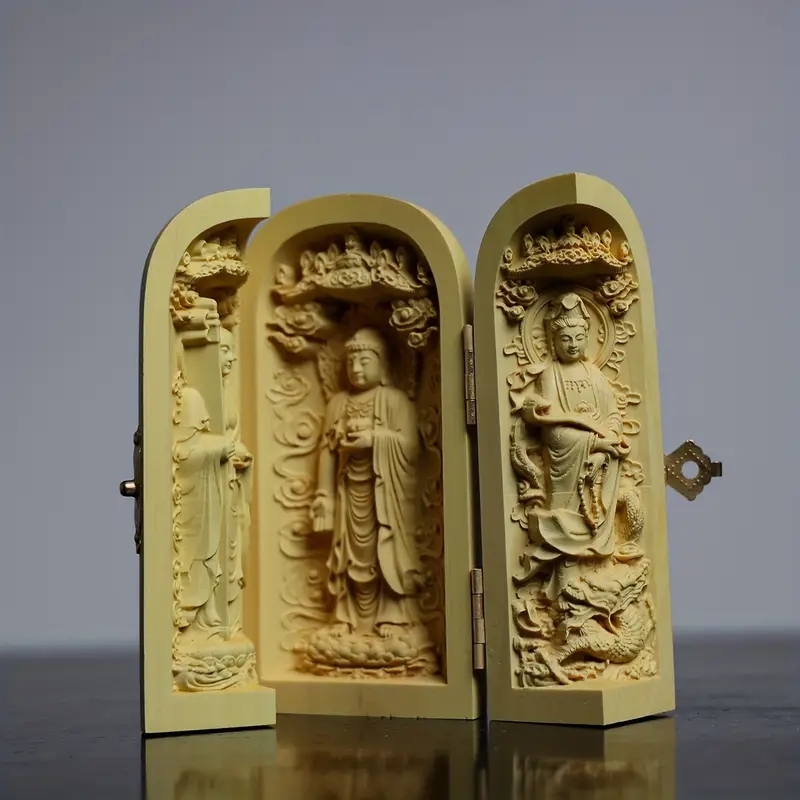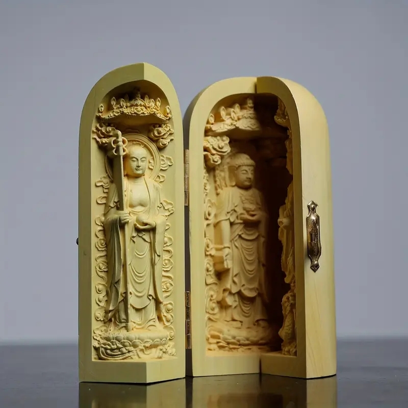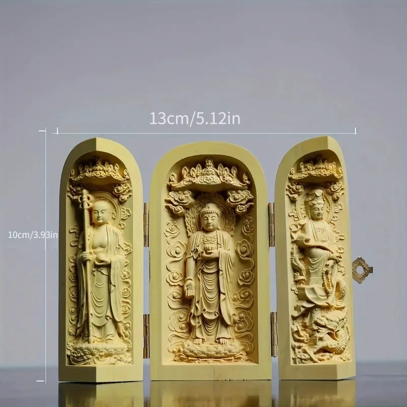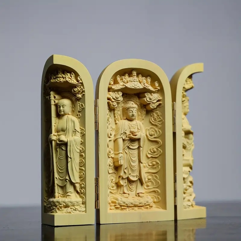 幸せを呼ぶ本黄楊細密彫懐中仏 金彩阿弥陀三尊 仏像阿弥陀三尊仏を稀少な黄楊に驚くほどの緻密さで彫刻されています。絶大なるご利益の阿弥陀三尊仏を、いつもお手元に。緻密な掘りが施された格調高い仏教美術作品閉じればコンパクトサイズ。黄金極楽浄土の主尊、在庫あります#大阪からの発送です、早くて安心。他の出品者、中国などからは税関検査などもあり 1~4週間かかり注意が必要です。他にも沢山出品しております是非ご覧くださいませ。