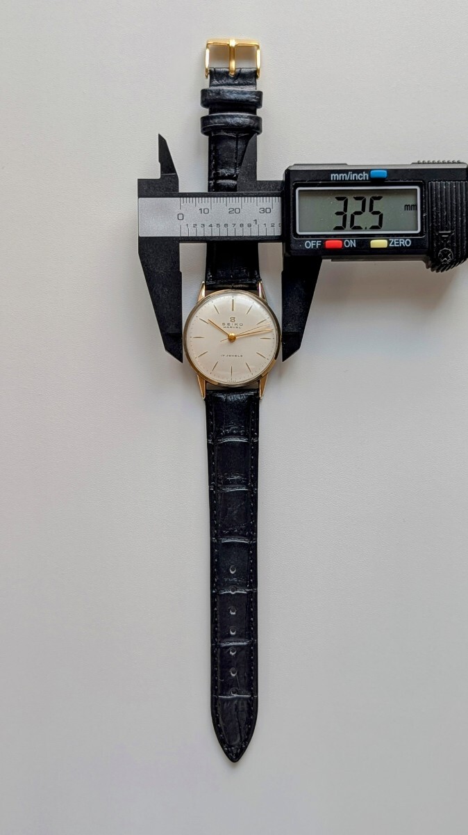 本体ケース径は竜頭を含まず横幅約32.5mmで当時のヴィンテージメンズサイズです。