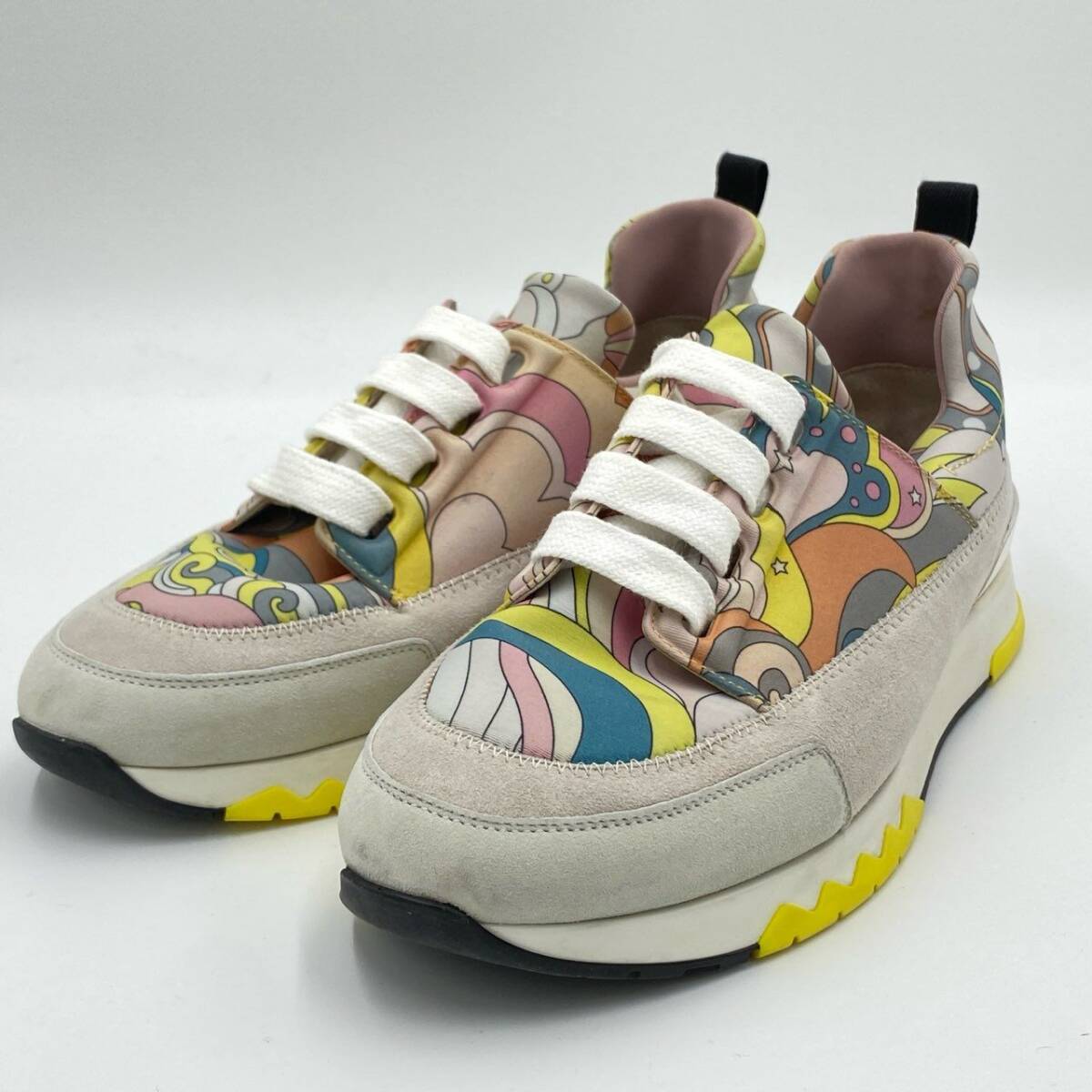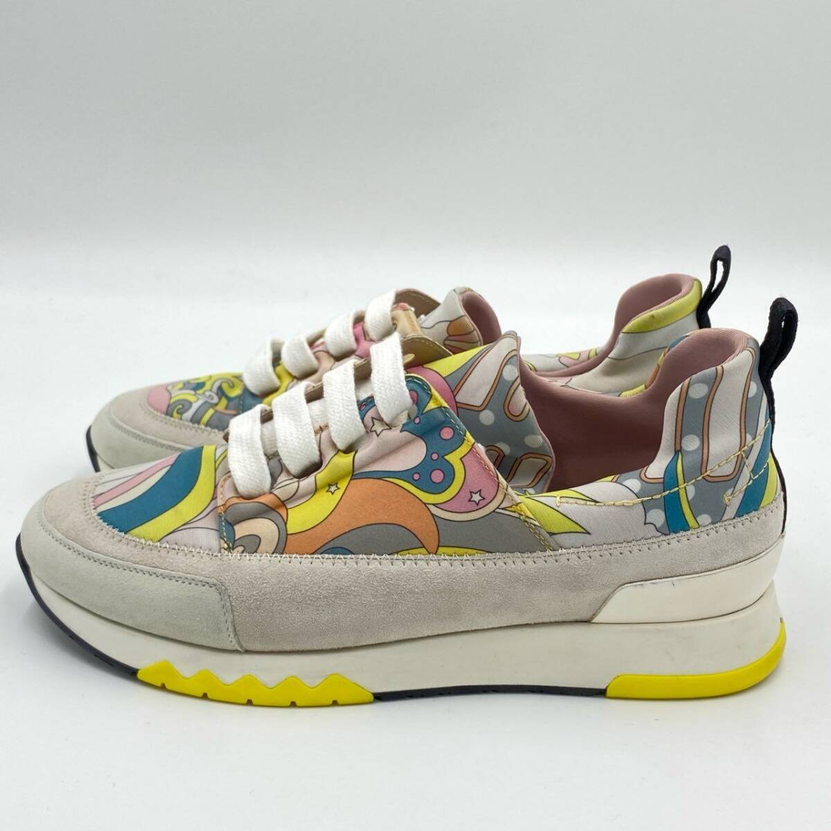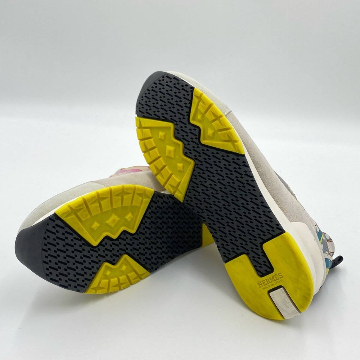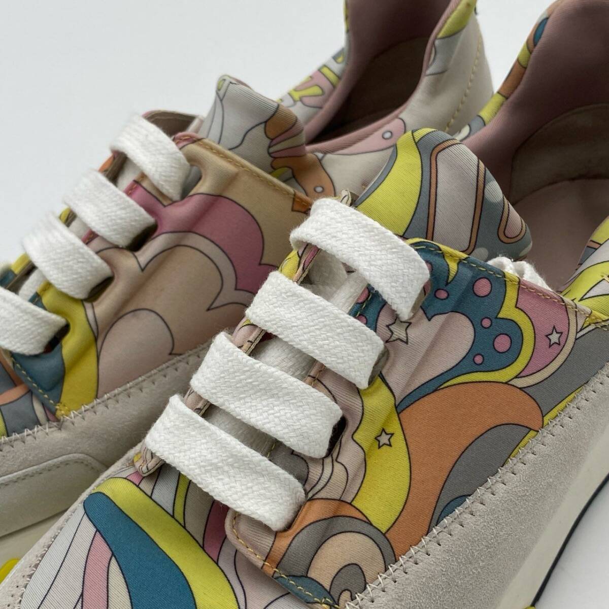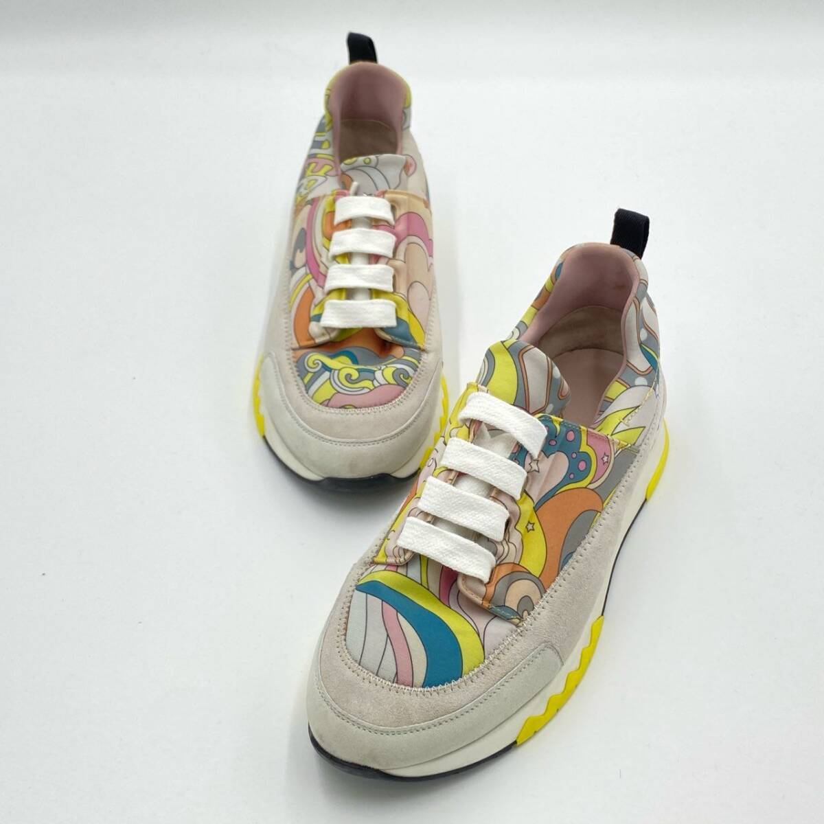 | スタッフ商品コメント | エルメスのレディーススニーカーは、カラフルなサイケデリック風の総柄プリントが目を惹く一足。ホワイトグレーのスエード素材との切替が上品さを加え、遊び心と高級感を両立したデザインです。アウトソールにはビビッドイエローのアクセントを施し、歩くたびに足元から元気を与えてくれます。休日の街歩きやリゾートカジュアルにぴったりで、コーディネートの主役になるアイテムです。 |