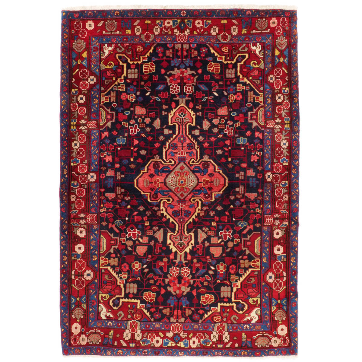 1960年代にイラン西部ハマダンで制作されたセミアンティーク絨毯です。中央に配された存在感あるメダリオンを中心に、濃紺のフィールドに色とりどりの小花や幾何文様が緻密に散りばめられています。