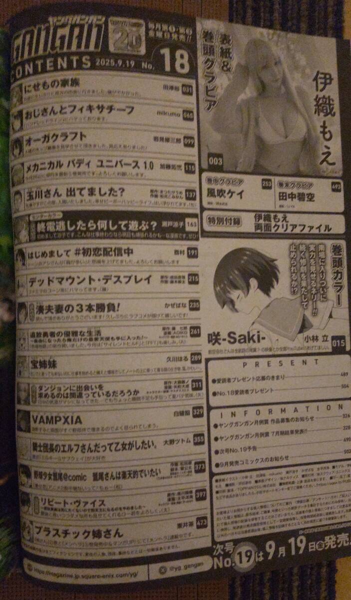 SQUARE ENIX ヤングガンガンNo.18 2025.0919 巻頭 伊織もえ 巻中 風吹ケイ 巻末 田中碧空 特別付録 伊織もえ両面クリアファイル未開封、応募券付です。| 出价者 | 信用 | 价格 | 时间 |
