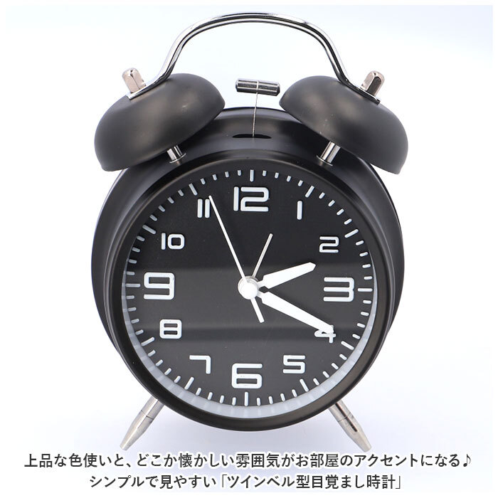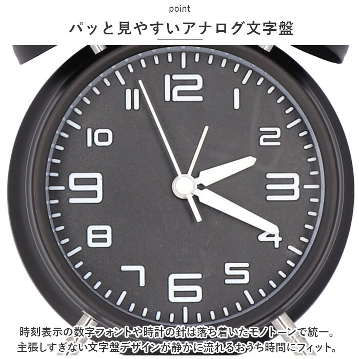 | 商品説明 | ・・上品な色使いと、どこか懐かしい雰囲気がお部屋のアクセントになる♪シンプルで見やすい「ツインベル型目覚まし時計」 ・【レトロなベル型クロック】 ・コロンと可愛らしい丸型の文字盤に、2つのベルを頭に乗せたアンティーク感のあるデザインが印象的なアラームクロック。 ・【パッと見やすいアナログ文字盤】 ・時刻表示の数字フォントや時計の針は落ち着いたモノトーンで統一。主張しすぎない文字盤デザインが静かに流れるおうち時間にフィット。 ・【アラームですっきりウェイクアップ】 ・・「ジリリリッ」と鳴り響くレトロなベル音の大音量アラームで、早起きの苦手なお寝坊さんでも毎朝の目覚めがスッキリ爽快。(※アラーム時刻設定用の目盛りは12分単位になります。アラーム設定をする際にお気をつけください。) ・【おやすみ時間を妨げない連続秒針】 ・就寝中や読書中など、快適なリラックスタイムを妨げない「静音ムーブメント」を採用。秒針の音が気になってしまう方や、自室や書斎でテレワークをされる方にもオススメ。 ・【バックライト機能付き】 ・背面の白いボタンを押すと、文字盤にほのかに灯りがともるバックライト機能付き。立体的なインデックス数字が光に浮かびあがり、夜間でも時間の確認がスムーズ。 ・【寝室にラクラク持ち運び】 ・ベル部分についたスチールのハンドルに指を掛ければ、寝室やこども部屋など、お気に入りの場所へ持ち運びラクラク。 ・【ご家族みんなで使いやすい♪】 ・シンプルで誰にでも使いやすく、お仕事で毎朝早起きされる方や、お子さまの目覚まし用に最適!(※単3形乾電池1本使用。電池は別売りです。) |
