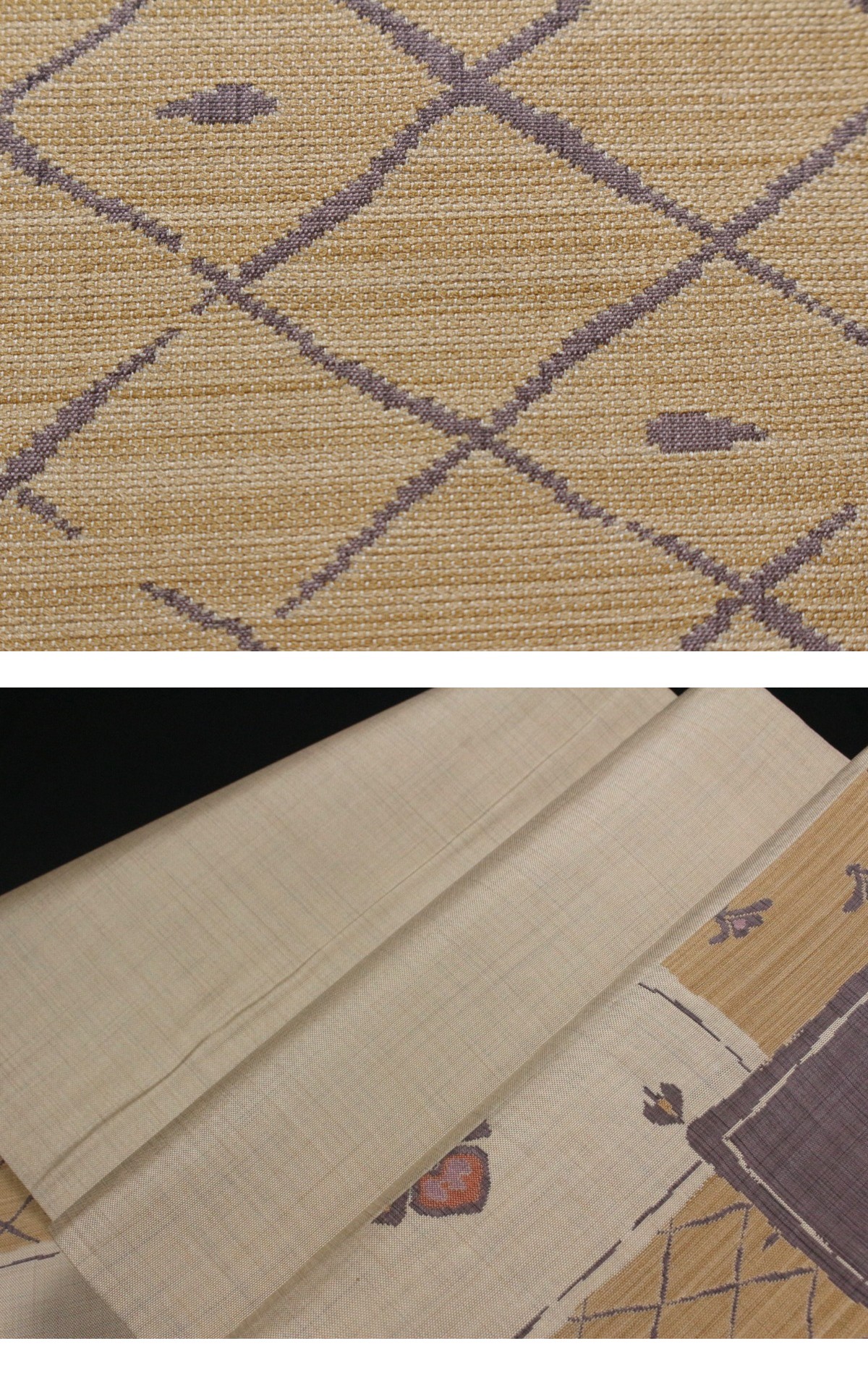 巧みな織技で知られる「巧風通」による、正絹袋帯のご紹介です。 市松のように区切られた枡目の中には、幾何文や花文、愛らしい草花文様が配され、素朴さと洒落感を兼ね備えた意匠となっております。 紫味を帯びた落ち着きある色調と、やわらかな生成りや黄土色との調和が美しく、和の趣を軽やかに映し出しています。 風通織は経糸と緯糸を複雑に組み合わせて文様を浮き立たせる高度な織技法で、表裏一体となった意匠が豊かな表情を生み出します。 そのため帯地には奥行きと深みがあり、趣味性を感じさせる洒落味のある装いに最適です。 紬や小紋などカジュアルな装いに合わせていただければ、軽やかな華やぎと洗練された印象を添えてくれます。 観劇、街歩きなど幅広い場面で活躍する一本。お目に留まりましたら、是非ご検討下さいませ。 ※撮影時の部屋の照明によって画像の色に若干の差がございます。色味に差がございますことをご了承のうえご検討下さいませ。 …状態… 締め跡あり。 ※全くの新品ではございませんので、記載のない変色やスレ、ヤケ、その他僅かな難がある場合がございます。そのような理由でのキャンセルはお受けできませんので、ご了承の上ご検討お願いいたします。 |