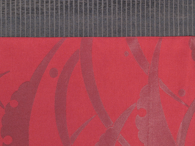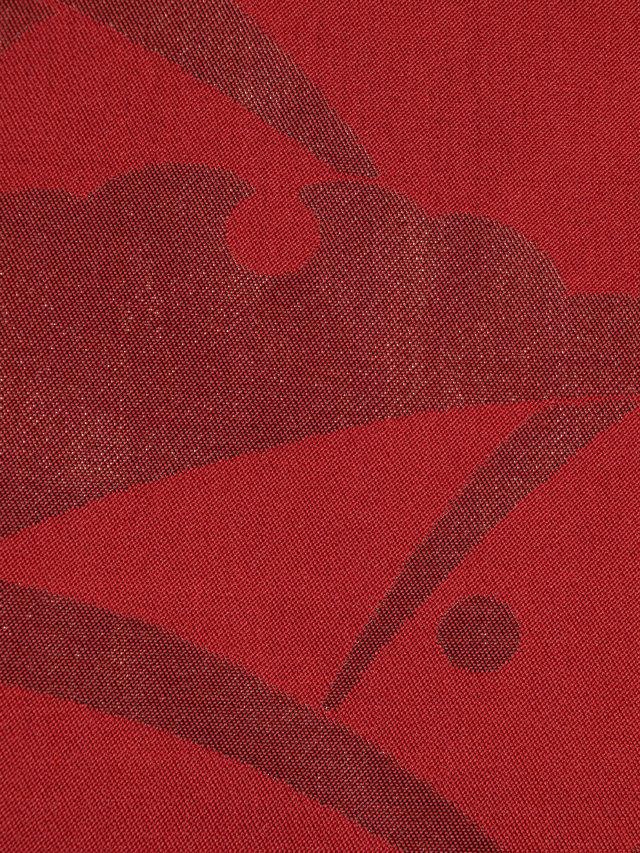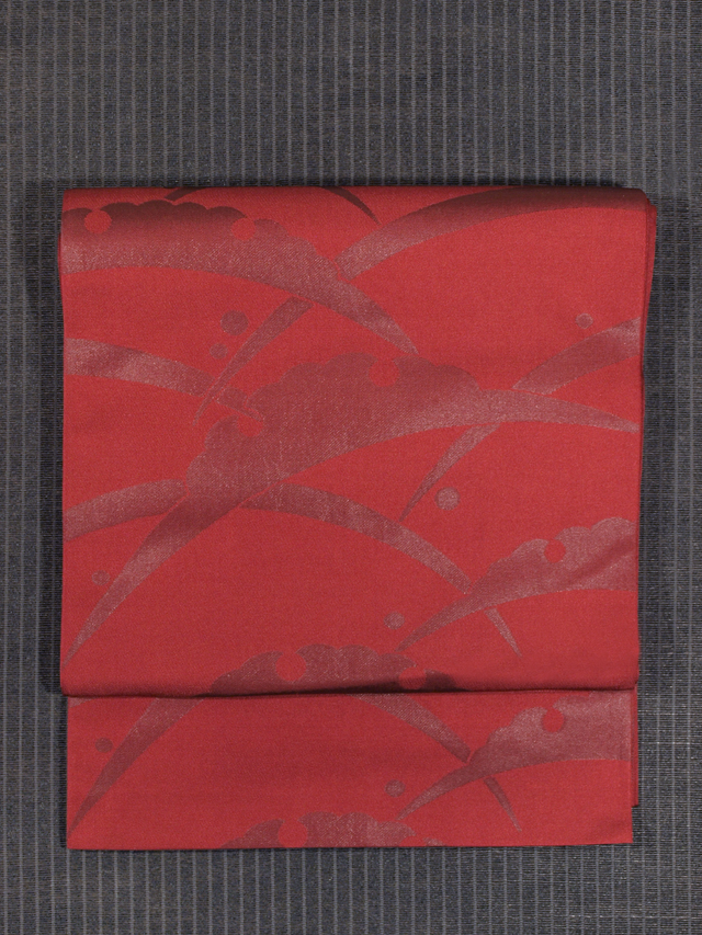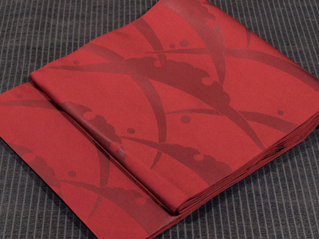 沈んだ深緋(こきひ)色といった感じの地に、箔糸で沈んだ濃(こき)色で雪輪露芝の文様が織り込まれている、西陣織の袋帯です。 伝統文様が深みのあるオトナの赤といった感じの赤系色のお色目であらわされていて、シンプルですが、意匠の完成度の高さが感じられます。 使用感はなく、未使用保管品と思われます。目につくしみやよごれ、褪色などのダメージもなく、きれいな状態です。 |