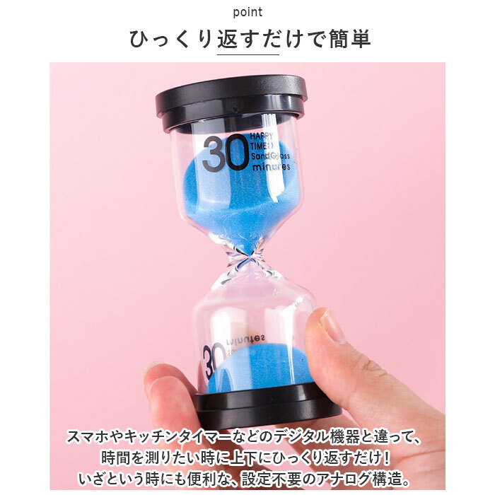 | 商品説明 | ・・手軽に時間を測れる!置いておくだけでインテリアになる砂時計♪ ・【ひっくり返すだけで簡単】 ・スマホやキッチンタイマーなどのデジタル機器と違って、時間を測りたい時に上下にひっくり返すだけ!いざという時にも便利な、設定不要のアナログ構造。 ・【シーンに合わせて使える6タイプ】 ・ひと目で時間がわかる数字表記をプリントした、3分・5分・10分・15分・20分・30分の6タイプをラインナップ!用途に応じて使い分けOK。(※製品の特性上、時間は目安となります。) ・【コンパクトサイズ】 ・手のひらに乗るサイズ感なので、置き場所に困らず省スペース。並べておいておくだけでもおしゃれ♪ ・【リラックスタイムのお供に】 ・ぼーっと眺めているだけで、ゆったりとした時間を感じさせてくれる!忙しい毎日の中に癒やしの時間を。 ・【知育道具としても活躍】 ・歯磨きや朝の準備、ゲーム時間・・・。お子さまが時間の感覚を身につけるトレーニングにもおすすめ! |