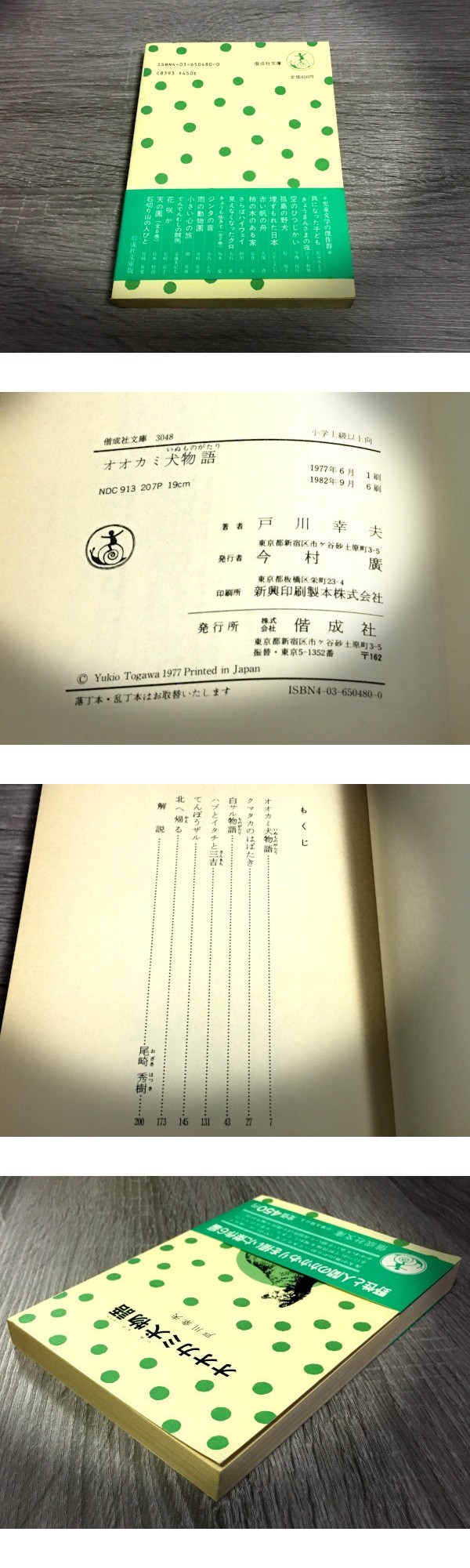 ------------------------------------------------------------------------ ж ж ж 商品について ж ж ж ------------------------------------------------------------------------ ◆ 「 オオカミ犬物語 / 戸川幸夫 」 ( 偕成社文庫 ) 元々カバーのない仕様です。 スレ、シワ、折れ、汚れ、などがあります。 経年の変色(ヤケ)が著しく、経年した書籍特有の 酸化した匂いなどがあります。 入手より経年しており、記載以外にも 初期、経年 による劣化、及び 保管時、取り扱い時などのダメージ必至です。 ※ 商品は 画像1枚目のもので全てです。 ※ 自身が 当時 新品で購入した ワンオーナー品です。 ※ 画像は 実物よりきれいに写ってしまう部分があります。 また、最初の検品・出品から 時間が経っているものは、掲載画像・説明にはない 劣化 及び ダメージの増加 など 必至です。商品状態は現物優先です。 ※ ペットなし、非喫煙環境です。 |