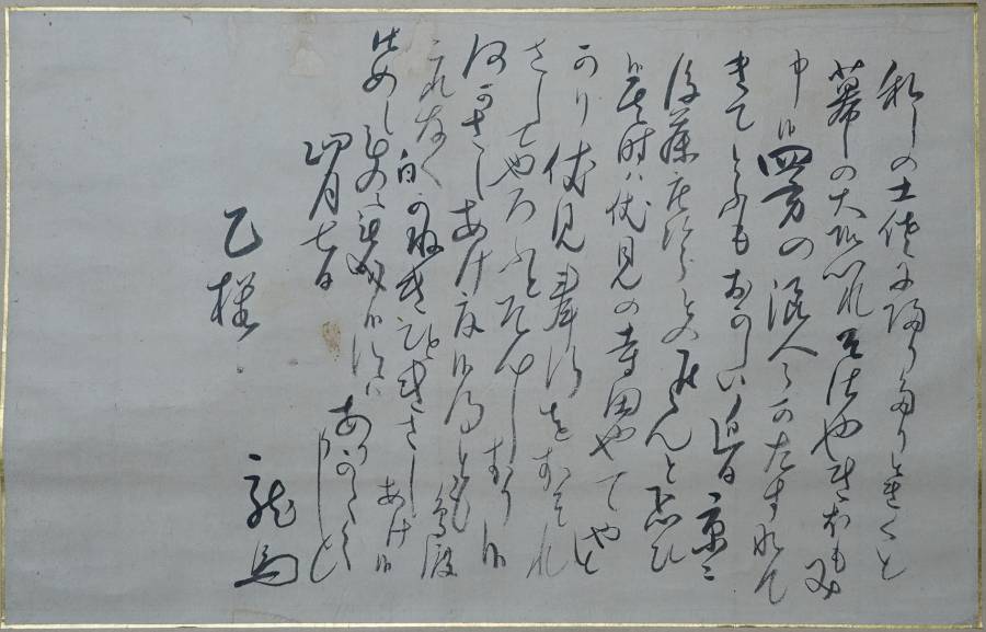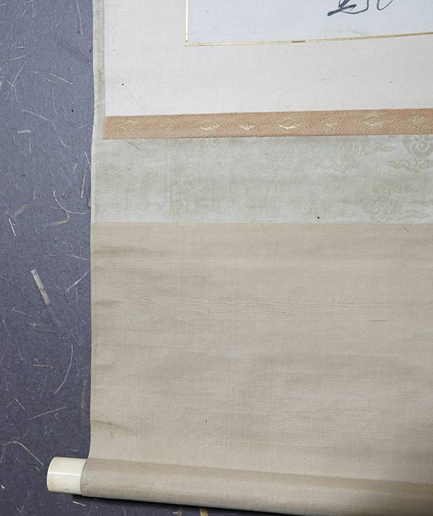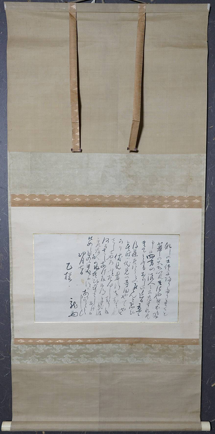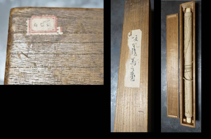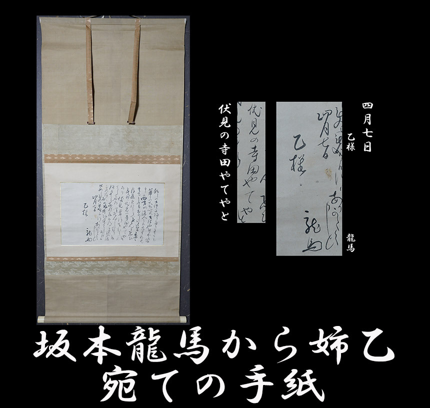 【サイズ】:表具が縦 124.5cm、横 56cm 本紙が縦 26cm、横 42cm 【本紙】:紙本。 【 箱 】:箱あり。 【状態】:本紙に染み全体的にはかけられるくらいには良好。 文中には寺田屋の記述。 |