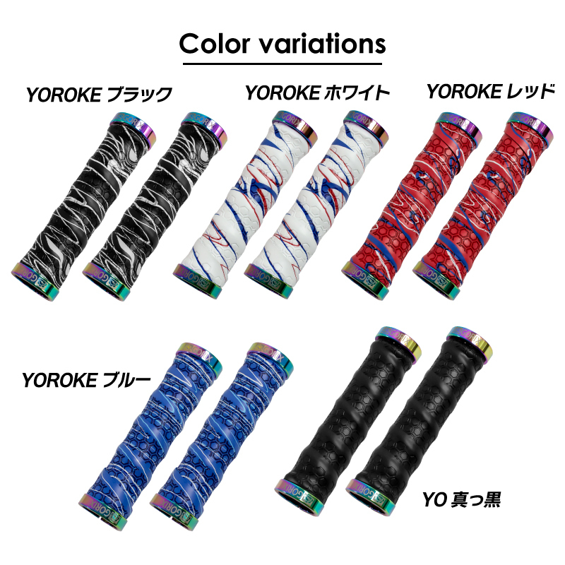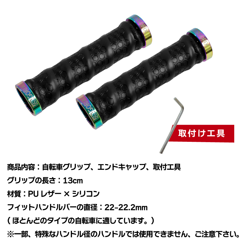 クロスバイクやMTBなどフラットハンドルのグリップ交換に! グリップ力と極上の握り心地のYOROKEシリーズ グリップにもYOROKEシリーズが登場しました! バーテープをはじめ野球バッドのグリップまで広がっています! [優れたグリップ力を実現] クッション性とグリップ力はGORIXのバーテープの中で最上位。 ウェットなコンディションでも高いコントロール性を発揮。 [滑り止め加工] 表面にはグリップ力を最大限に発揮できるように滑り止め加工を施しています。 [PUレザーとシリコン] ベタベタしない表面素材。 シリコンを配合しているので汚れが付着しても落としやすく、伸ばしてもちぎれにくいのが特徴です。 綺麗をキープします。 [耐久性] 強度が高く耐久性があります。 テープはすぐよれず長期間の使用をサポート。 [触り心地抜群] もちもち系の触り心地と弾力性があります。 長時間ライドも快適に。 [ダブルロックオン] 両サイドを固定するダブルロックオンタイプ。 しっかり固定するのでずれない。 両サイドのリングはオイルスリックで今風でおしゃれに。 内部の黒い芯が滑りやすくハンドルに装着する時、ゴムより楽に装着可能。 [柄デザイン] まだら模様で個性的。 自転車グリップでは珍しいい柄入りデザイン。 オールブラックの単色もラインナップ。 商品内容自転車グリップ、エンドキャップ、六角工具 グリップ長さ13cm 材質PUレザー×シリコン フィットハンドルバーの直径22-22.2mm(ほとんどのタイプの自転車に適しています。) ※一部、特殊なハンドル径のハンドルでは使用できませんので、ご注意下さい。 重量(約)83g(ペア) ・商品は入荷によりキズがある場合があります。 その場合は保証対象外になりますのでご了承お願い致します。 ・ディスプレイ環境により実物と色が異なる場合が有ります。 ・入荷時期により予告無く一部仕様変更する場合が有ります。 | |