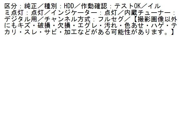 | 商品情報 | 区分:純正/種別:HDD/作動確認:テストOK/イルミ点灯:点灯/インジケーター:点灯/内蔵チューナー:デジタル用/チャンネル方式:フルセグ/【撮影画像以外にもキズ・破損・欠損・エグレ・汚れ・色あせ・ハゲ・テカリ・スレ・サビ・加工などがある可能性があります。】 | ||