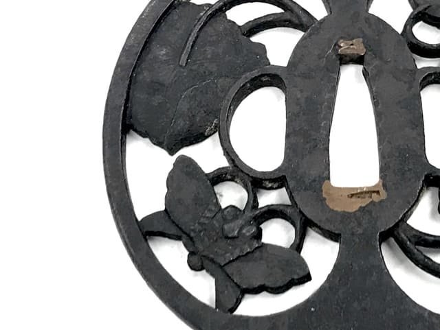 正阿弥鍔 蝶と河骨図透 京正阿弥写し Φ約85.0mm×H約6.0mm 重量 約140.0g 江戸初期 丸形 鉄地 共箱あり 美術刀剣 [浏览原始页面]