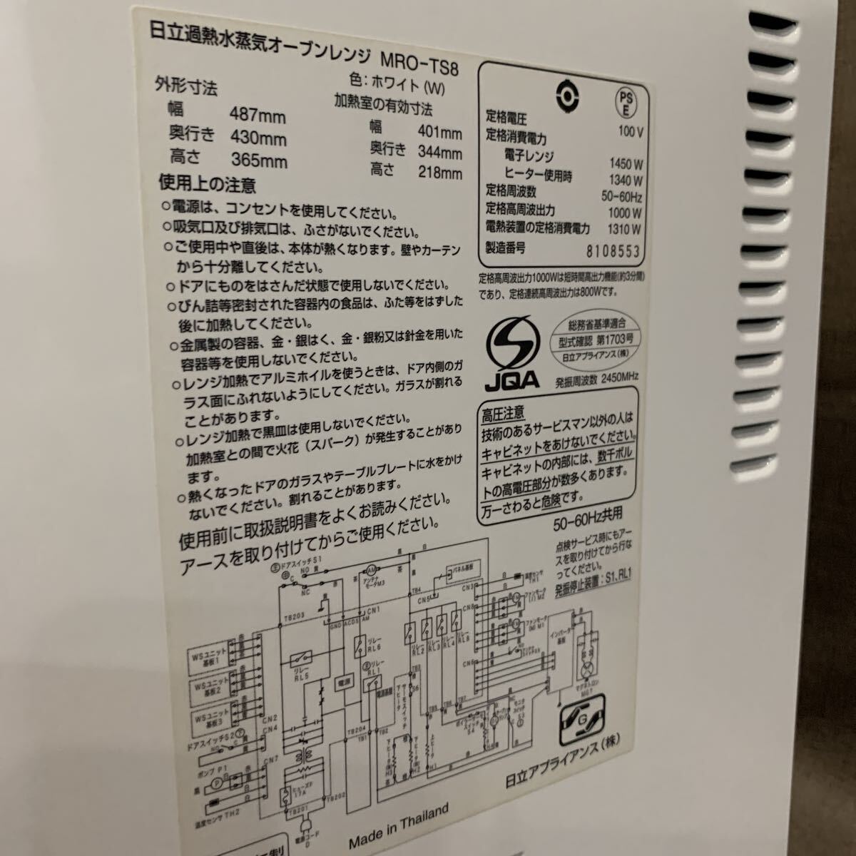 37【2018年製】日立過熱水蒸気オーブンレンジMRO-TS8 (W) 50-60HZ ご
