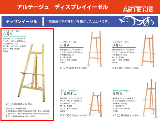 アルテージュ デッサンイーゼル No.8号V を出品いたします。 ■特徴■ 無塗装で木の味わいを 生かした仕上げです。 独自のスライド機構を搭載。 より垂直に近い角度での作品製作が可能。 また、傾斜角度に左右されず、 脚部の接地位置が常に一定で 安定感があります。 (傾斜角度は後傾3度~16度) デッサン以外にもお店での ポスター展示等にもオススメです。 メーカーHPもご覧ください 内容物確認のため開梱していますが、 実使用のない未使用品です。 写真に写っているものが全てのセット品です。 発送は佐川飛脚ラージサイズ宅配便でお送りします。 定価14,200円の非常に高価な商品です。 格安出品いたしますのでこの機会をお見逃しなく! |