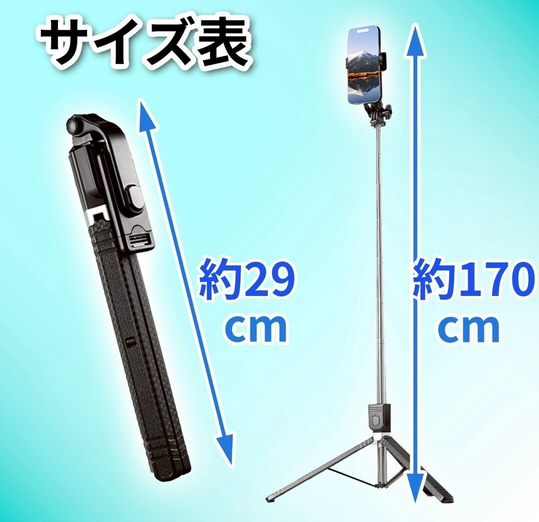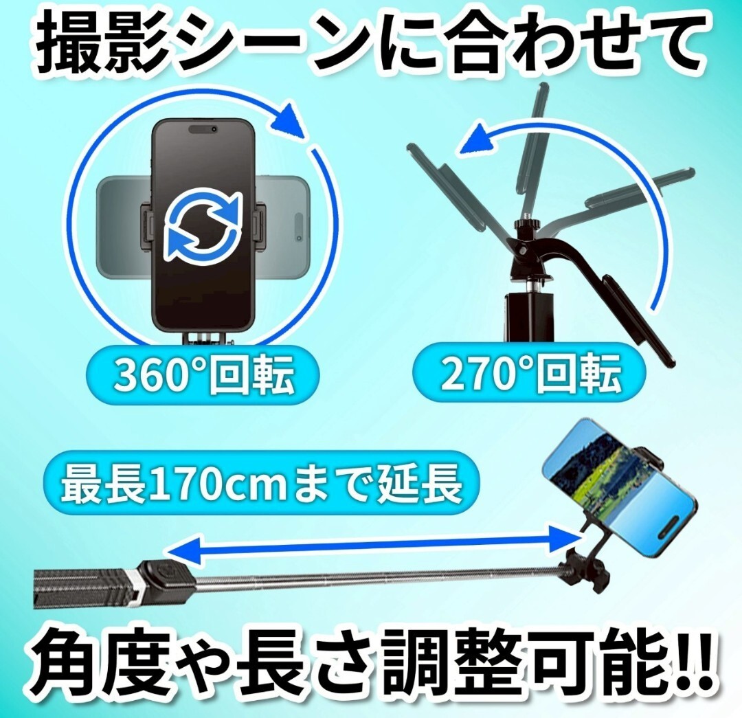 7段階の伸縮・収納方式を採用し、最大170cmに伸びるので、広い範囲の撮影や高い位置から撮影したいときに便利☆