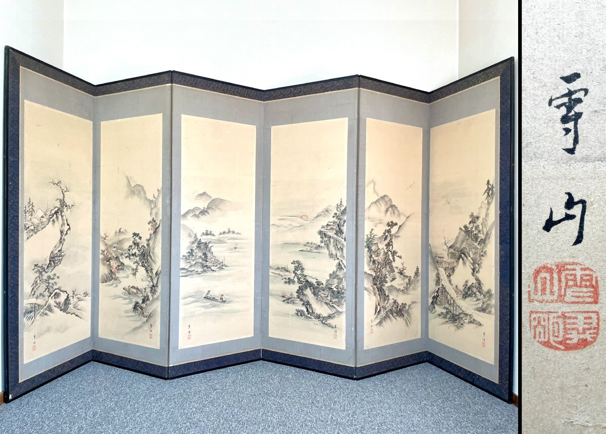 A127【真作】長塩雪山 山水画 人物画 花鳥画 船 鶴 六曲屏風 六曲半双 時代屏風 間仕切 半双 折畳 折り畳み 衝立 つい立 背景