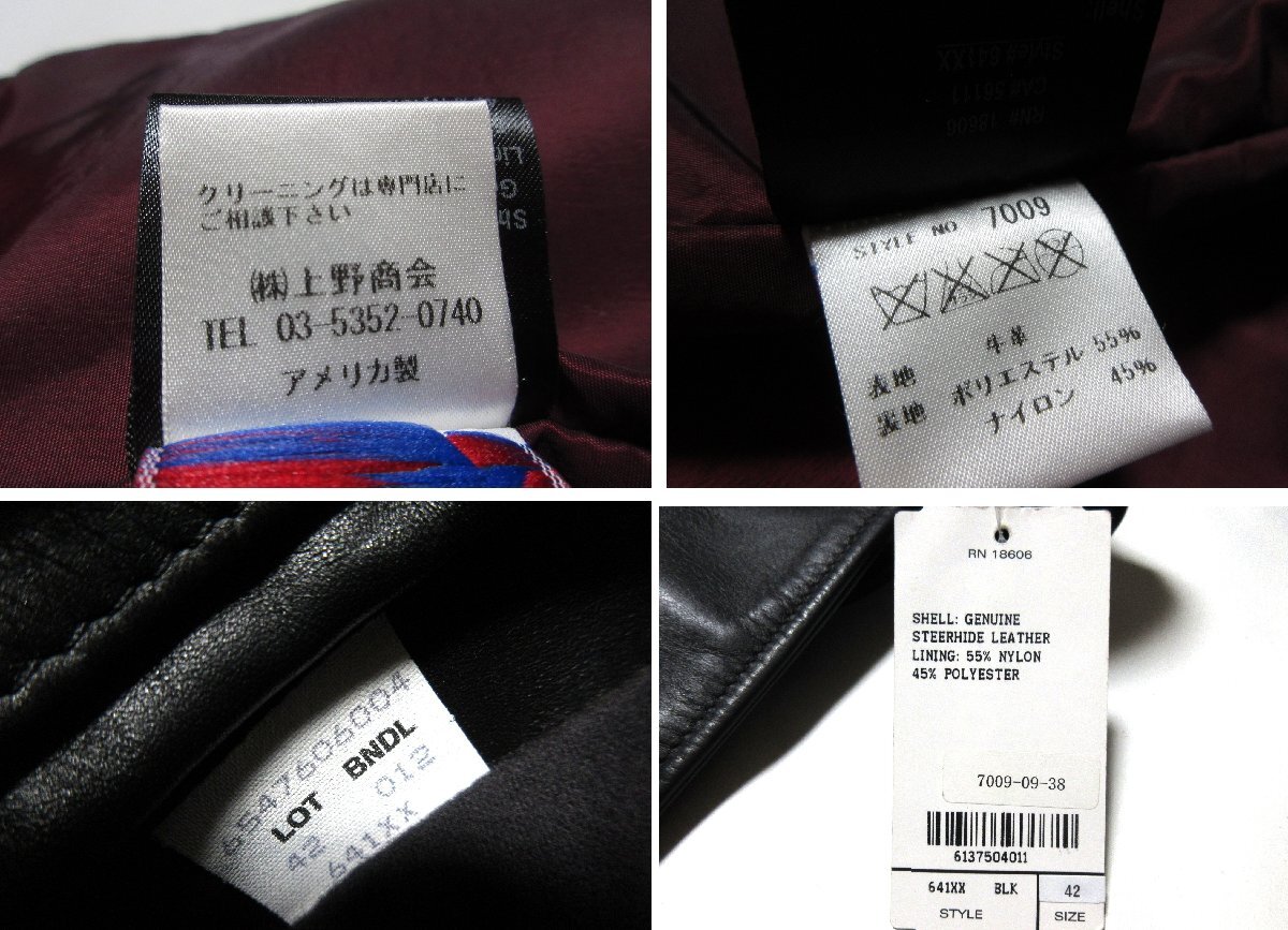 ●MADE IN USA/米国製/上野商会別注品 | ●定価:¥159,500 (税込) ●Model:641XX/7009 ●素材:牛革、裏地/ナイロン55%ポリエステル45% ●カラー:ブラック ●サイズ表記 42 *実寸(平置き 約㎝) ・袖丈 65 (肩ステッチから袖先) ・肩幅 49 (肩ステッチから肩ステッチ) ・身幅 59 (脇下から脇下) ・着丈 64 (後ろ襟元付け根から裾) (※袖丈、身幅はフロント側から、肩幅、着丈は背中側をラインに沿って測定しています。多少の誤差はご了承下さい) 日本限定で復刻した641XXは、現行の641モデルと違い1960年代に生産されていたモデル。上質な ジェニュインステアハイドを採用し、ディテールやサイズスペックを忠実に再現しています。実際にバイクに乗ることを考えた仕様となっており、ショルダー部分の後ろ側 にはアクションプリーツが施され、ウエストアジャスターがなく、ライダーの内臓を守る為施されたウエスト後部の切り替えが可能なキドニーパッドを採用。身幅、腕繰りはタイトに、着丈、袖丈はやや長めに変更され、日本人の体系にジャストフィットする綺麗なシルエットとなっています。米国製。