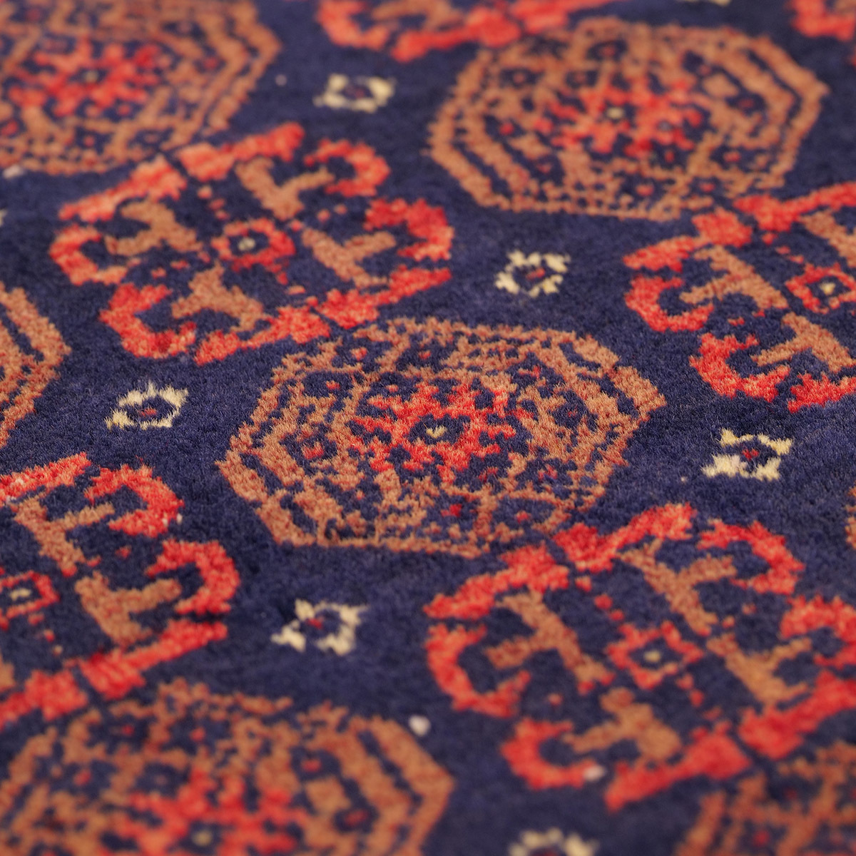 1960年代に制作されたバルーチ産のセミアンティークラグです。全体にミナハニ文様が広がり、花を連ねた円環が連続する構図は、生命の循環や自然の調和を象徴しています。バルーチの伝統美と手織りの精緻さが見事に調和し、静かな華やかさを漂わせる逸品です。