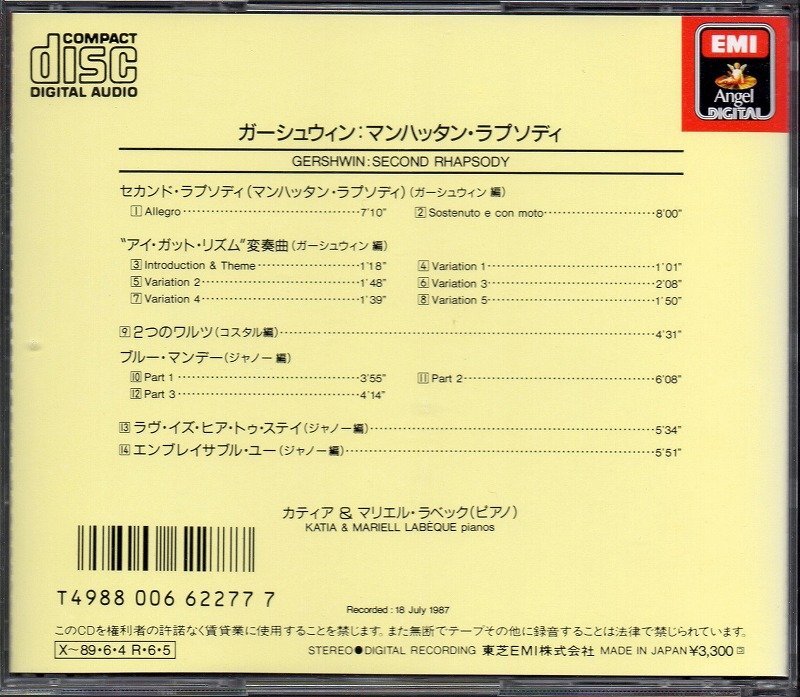 -ラベッック姉妹 EMIへの2枚目のガーシュウィン・アルバムでした。[1,2]は管弦楽付きのピアノ作品からガーシュウィン自身の2台ピアノ用編曲。-一方[4]は24歳の時に書いた1幕の短いオペラ「ブルー マンデイ」からの3つの音楽でしょう。些細な行き違いから酒場で女が男を殺すという内容ですが、名作「ポーギーとベス」同様 黒人社会の物語であるという意欲作です。ガーシュウィンは当時はまだオーケストレイションができなかったため 他人に依頼しましたが、この2台ピアノ版はガーシュウィンのオリジナル・スコアに基づくものなのかもしれません。