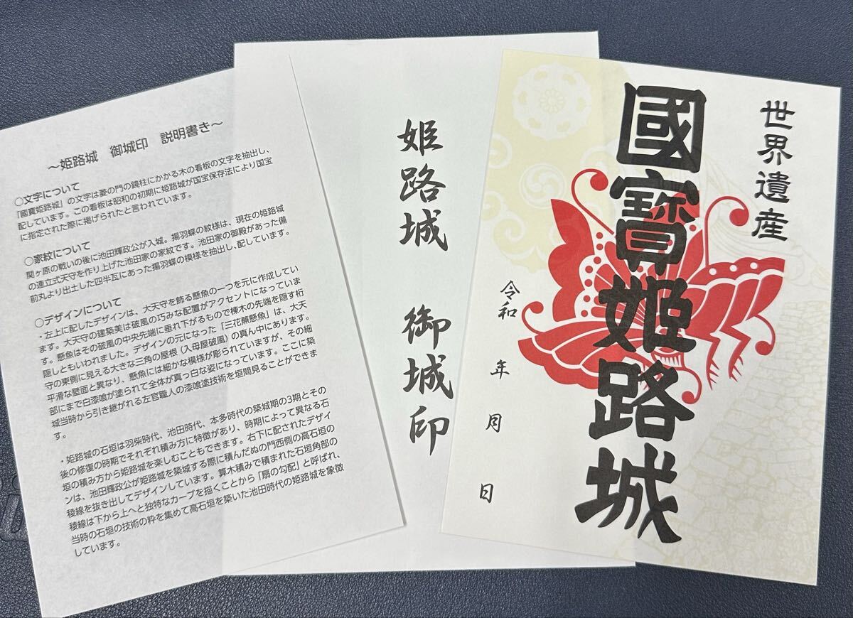 「國寶姫路城」の文字は菱の門の鏡柱にかかる木の看板の文字を抽出、家紋は池田家の御殿があった備前丸より出土した四半瓦にあった揚羽蝶の模様を抽出している。