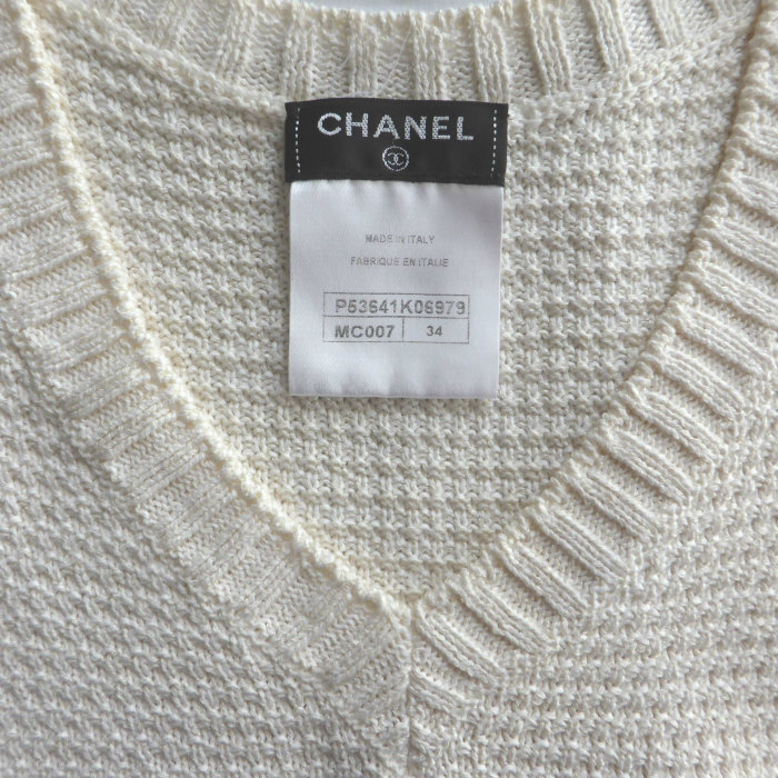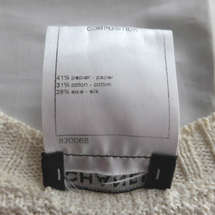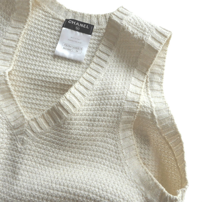 | シャネルのニットベスト。 紙を素材に組み込んだ涼しげのある生地感が特徴。 裾もとのボーダー柄がカジュアルさをプラスします。 くすんだホワイトの色味やシェイプのかかったウエスト周りが女性らしい雰囲気を醸し出します。 裾もとのオリジナルの装飾がフェミニンに仕上げ、高級感あふれる逸品です。 |