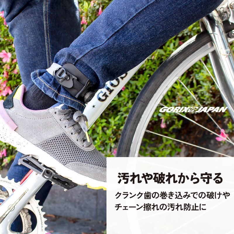 チェーンやクランクに擦れてズボンが汚れたり、クランクに巻き込まれズボンが破けたりするのを防止します。