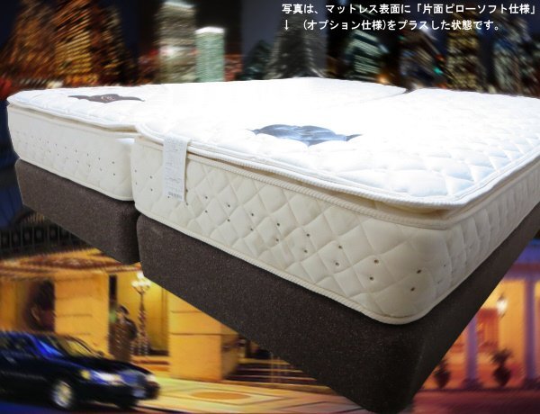 ★全国の有名ホテル、一流ホテルの客室で、実際に採用されているベッドです。(市販のお店では買えません) ★こちらのサイズはQ2(クイーン)サイズです。(横幅; 1,640mm x 長さ; 1,970mm x 高さ; 470mm) ★「上・下セット( x 1台)」のお値段です(固定脚・キャスターセット)。 ★マットレスは、「一本物仕様」か、「二分割ジョイント仕様」を、お選び頂けます。 (下のボトムはいずれの場合も二分割となります)。 寝室までの搬入経路など、ご確認を頂きまして、お選び下さいませ。 「二分割ジョイント仕様」の場合、2台のマットレスをジョイントして頂きますと、「1,640mm巾」の大きなベッドとしてもお使い頂けますし、ジョイン ト部は簡単に着脱可能ですので、ジョイントを外せば、x 2台の別々のベッド(820mm巾 x 2)としてもお使い頂けます。 ★下部のボトム(ボックススプリング)内にもコイルが組み込まれており、クッション性があります。 (上のマットレスが受ける体圧・荷重を下のボトム部分でも吸収・分散し、耐久性を高める機能を果たします。より深みのある寝心地も実現しています。) ★マットレスのお色柄は「シルキーホワイト」、ボトムのお色は「チョコブラウン」です。 (ボトムのお色は「ロイヤルブラック」・「プレイングレイ」・「スイートベージュ」へのご変更も可能です。) ★ベッドカバーやシーツ・ベッドパッド・枕などの寝装品やヘッドボード等は別売となります。 ★ご希望の場合、マットレス表面の「ピローソフト仕様」の追加も可能です。 マットレス表面のソフト感がアップするスイートルーム仕様です。(「片面仕様」と「両面仕様」があります) ★「送料無料」(部屋内搬入・設置迄対応)です。 ★受注生産となります為、製造期間を頂戴致します。 (お引越し等の場合、工場で仕上がって以降でしたら、配達日のご指定は可能です。ご自宅がご新築や改装工事の場合、ご希望日までこちらで保管することも可能です。) ★オークションに関するお問合せ等はお気軽にこちらまで。 ↓オークション出品商品のサイズや仕様等につきましては、ホームページ内の仕様もご参照くださいませ↓ ★「一流ホテルのベッド」★ |