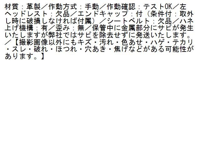 | 商品情報 | 材質:革製/作動方式:手動/作動確認:テストOK/左ヘッドレスト:欠品/エンドキャップ:付(条件付:取外し時に破損しなければ付属)/シートベルト:欠品/ハネ上げ機構:有/歪み:無/保管中に金属部分にサビが発生いたしますが弊社ではサビを除去せずに発送いたします。/【撮影画像以外にもキズ・汚れ・色あせ・ハゲ・テカリ・スレ・破れ・ほつれ・穴あき・焦げなどがある可能性があります。】 | ||