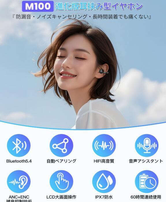 イヤホンbluetooth ワイヤレスイヤホン【多機能タッチスクリーンANC+ENC対応 2025革新モデル】イヤーカフ Bluetooth5.4技術 Hi-Fi音質 ノイズキャンセリング オープンイヤー 耳挟み型 音漏れ防止 ブルートゥース 48時間再生時間/IPX7防水/Type-C充電/小型/軽量 iPhone/Android/Pad適用 スポーツ/通勤/WEB会議