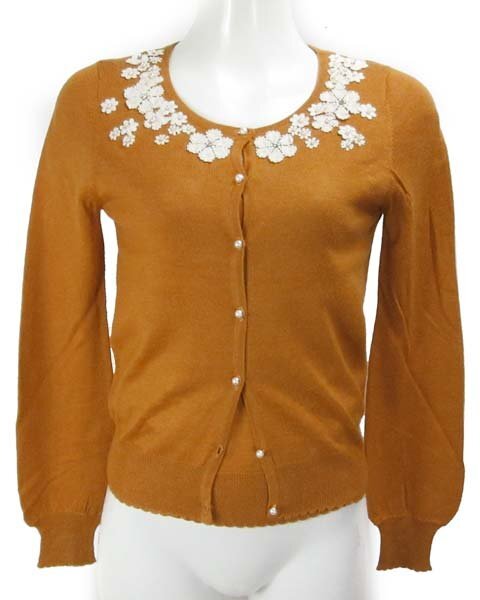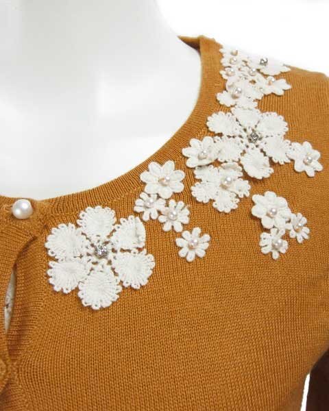 | シーズンライクなカラーリングのアンサンブルです。パールとラインストーンをあしらった花モチーフが首元を明るく魅せてくれるカーディガンと半袖ニットです。しっとり柔らかい生地感で、スカートなどにもよく合います。 |
