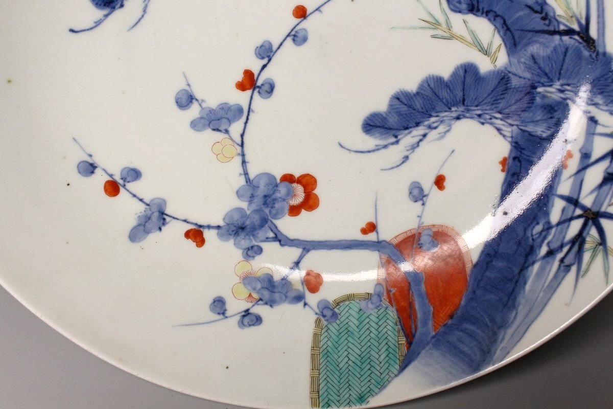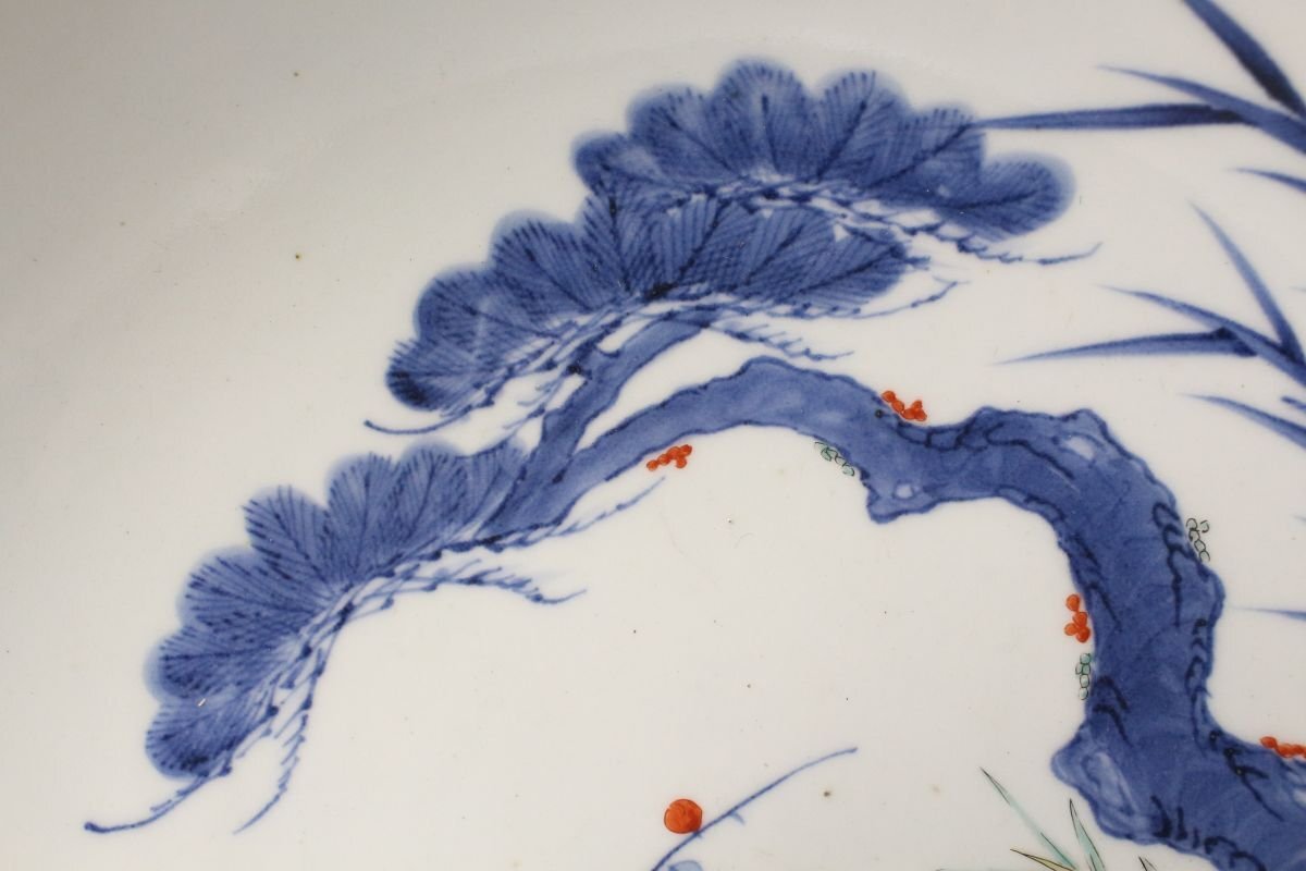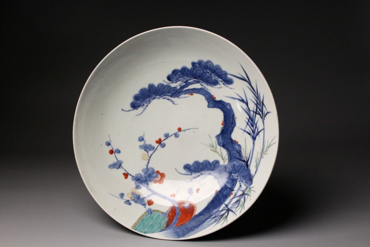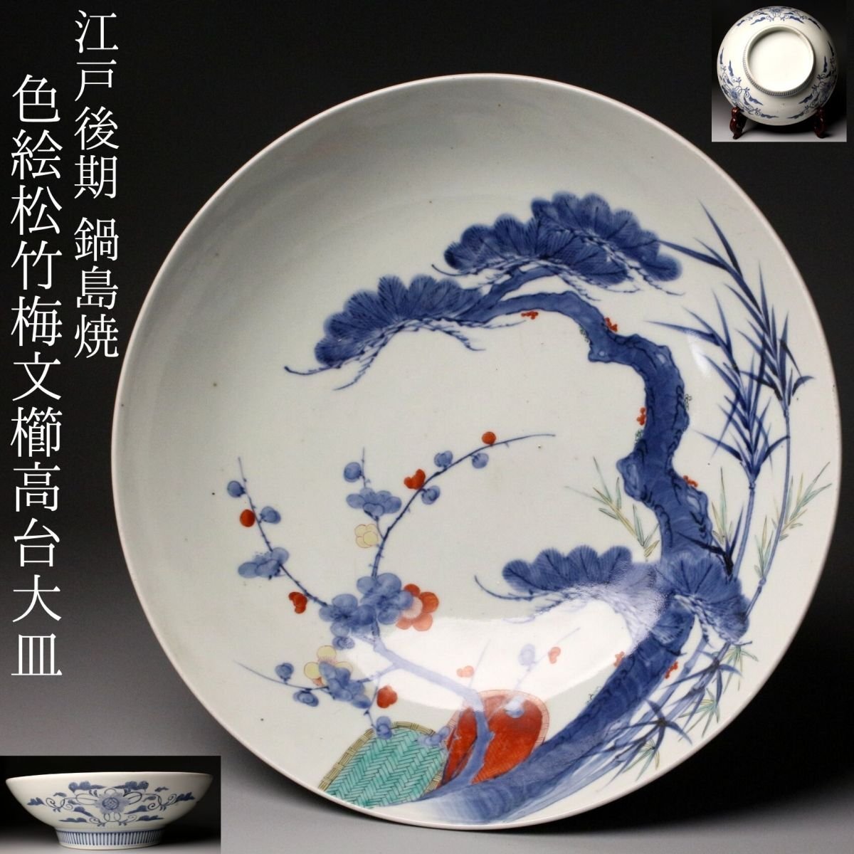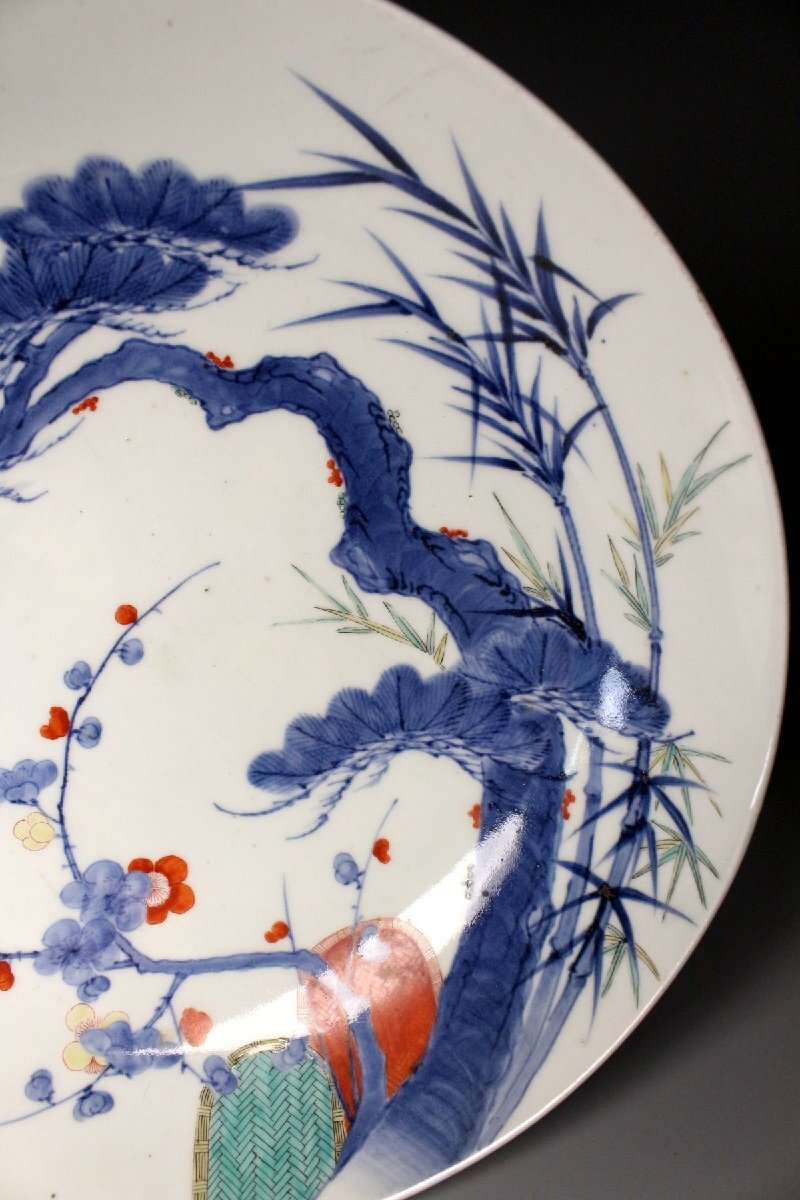 [.QQ]25.11 25110903A* * * 商品詳細 * * * ここでしか出逢うことのできない唯一の美をご紹介させて頂きます。 江戸後期の雅趣を端正に映す、鍋島焼〈色絵松竹梅文 櫛高台大皿〉。 直径約30cmの堂々たる大皿に、松・竹・梅の吉祥文様が鮮やかに描かれ、 鍋島焼特有の緻密さと気品が存分に発揮された一枚です。 松の力強さ、竹のしなやかさ、梅の可憐さ。 三つの文様が調和し、全体に静かな格調と華やぎを漂わせています。 さらに、特徴的な櫛高台が作品に引き締まった印象を与え、 器の表裏にわたって細部まで丁寧に作り込まれた姿は、 鑑賞皿としても、空間を格調高く彩る存在となっています。 鍋島焼の美の粋を伝える、華やかさと端正さを兼ね備えた大皿。 江戸後期の品格を手元で味わえる、見応えある逸品です。 ■サイズ/横30㎝×高9㎝ ■状態/ 経年によるスレ、小傷、汚れがございます。 ※皿立ては付属致しません。 ※写真にてご確認、ご了承の上ご入札下さい。