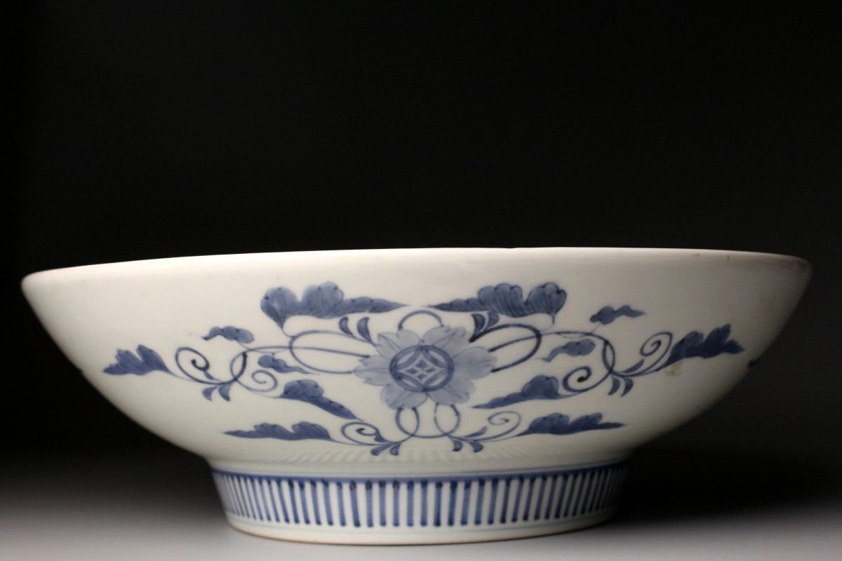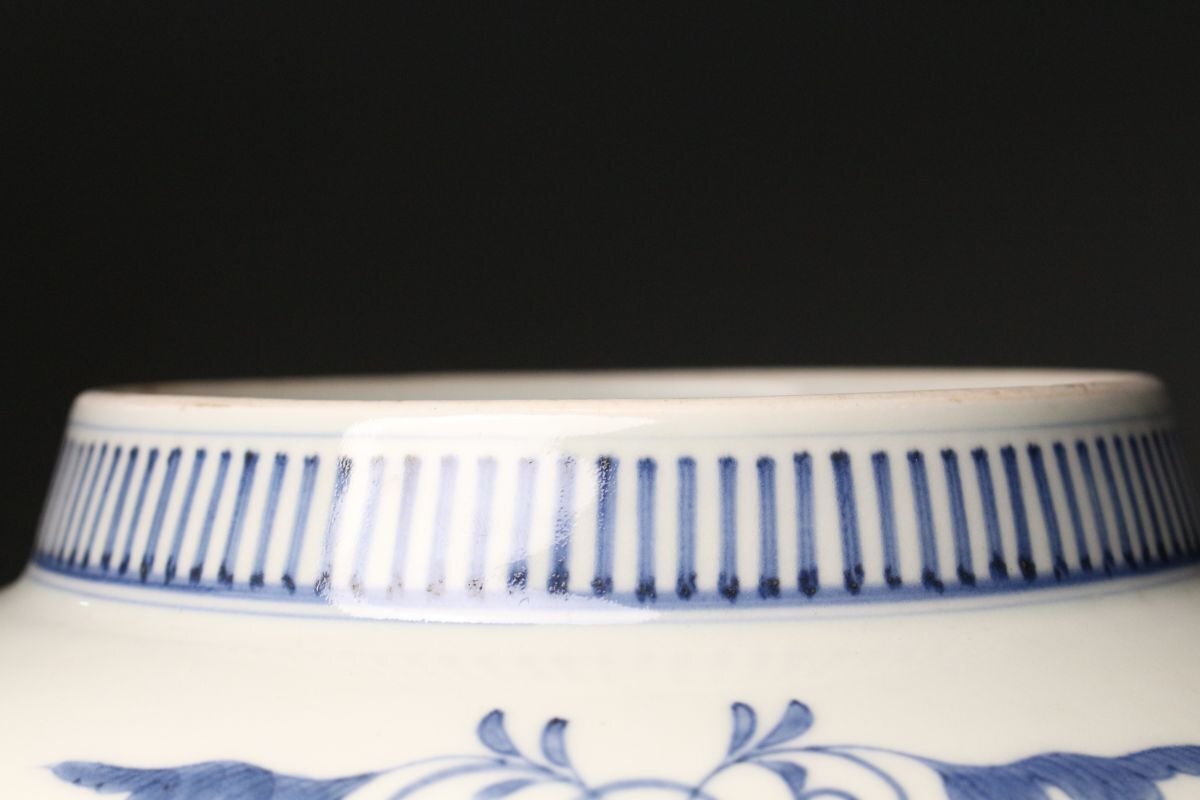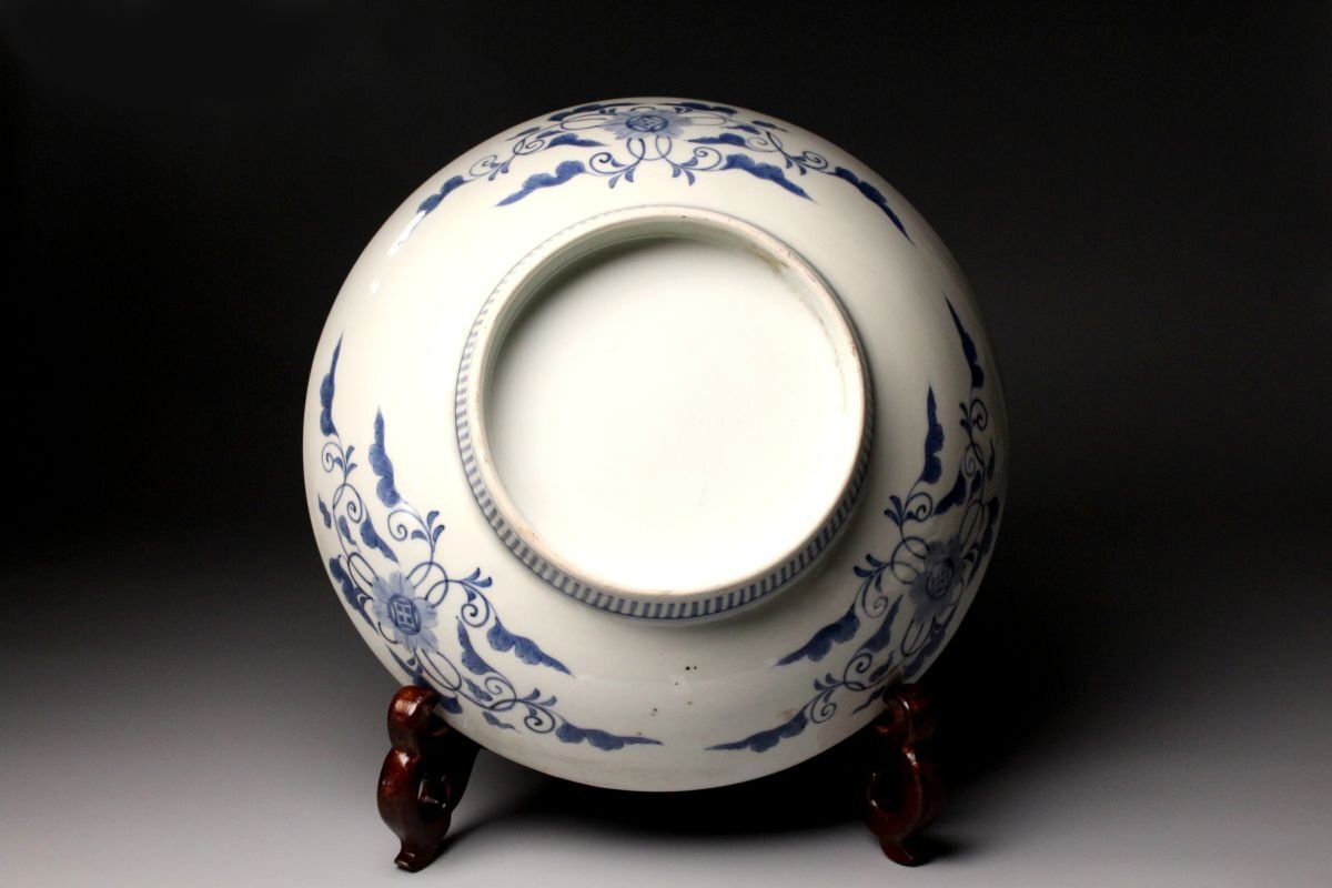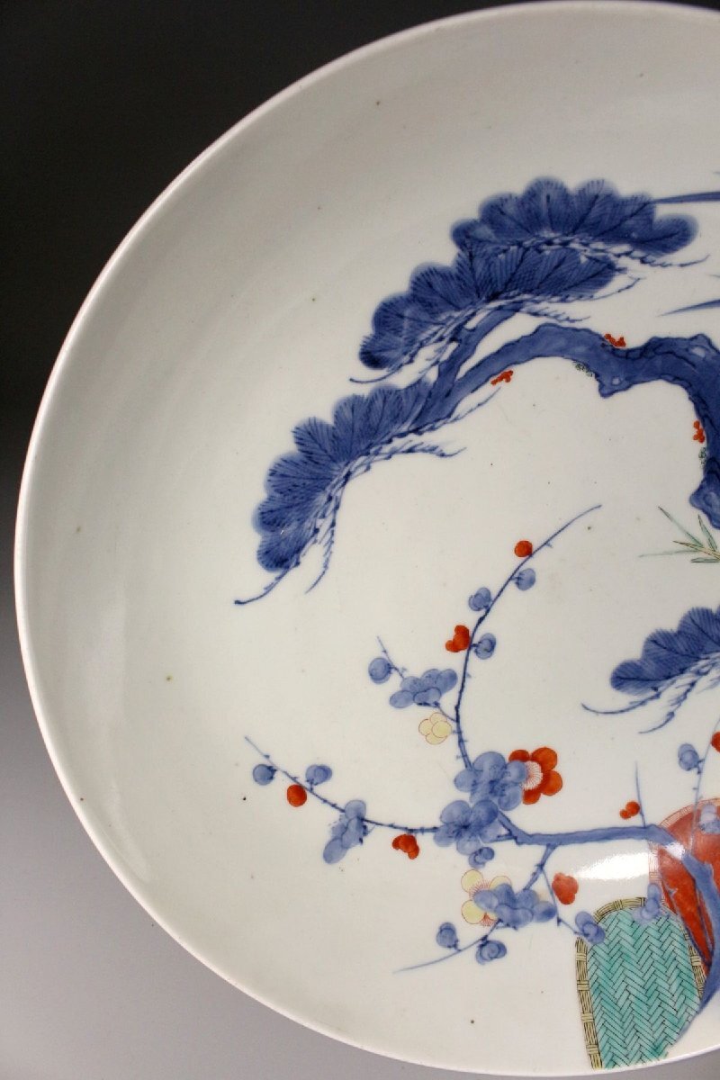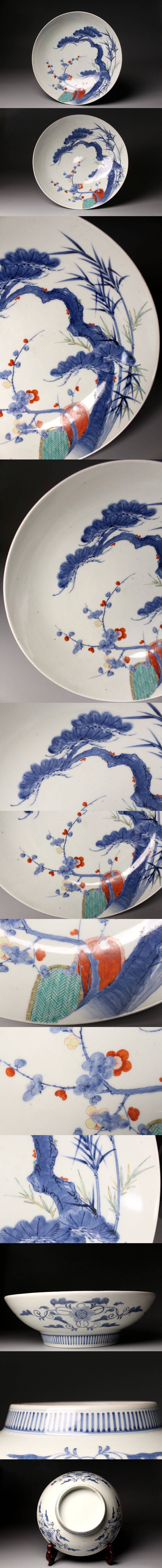 [.QQ]25.11 25110903A* * * 商品詳細 * * * ここでしか出逢うことのできない唯一の美をご紹介させて頂きます。 江戸後期の雅趣を端正に映す、鍋島焼〈色絵松竹梅文 櫛高台大皿〉。 直径約30cmの堂々たる大皿に、松・竹・梅の吉祥文様が鮮やかに描かれ、 鍋島焼特有の緻密さと気品が存分に発揮された一枚です。 松の力強さ、竹のしなやかさ、梅の可憐さ。 三つの文様が調和し、全体に静かな格調と華やぎを漂わせています。 さらに、特徴的な櫛高台が作品に引き締まった印象を与え、 器の表裏にわたって細部まで丁寧に作り込まれた姿は、 鑑賞皿としても、空間を格調高く彩る存在となっています。 鍋島焼の美の粋を伝える、華やかさと端正さを兼ね備えた大皿。 江戸後期の品格を手元で味わえる、見応えある逸品です。 ■サイズ/横30㎝×高9㎝ ■状態/ 経年によるスレ、小傷、汚れがございます。 ※皿立ては付属致しません。 ※写真にてご確認、ご了承の上ご入札下さい。