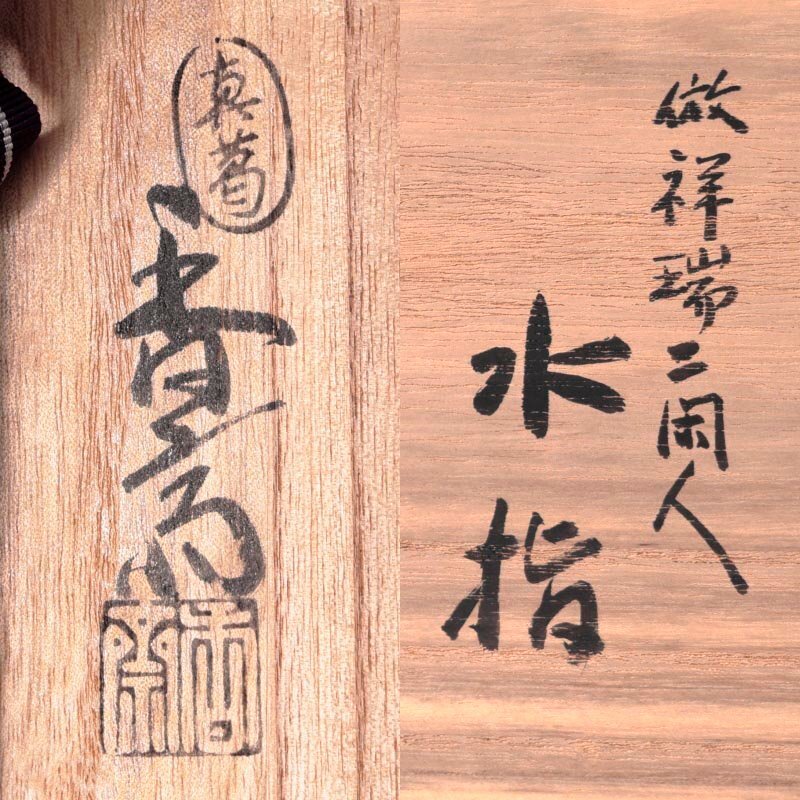 【真葛香斎】 真葛焼を確立した祐閑宮川小兵衛政一の長男、祐翁治兵衛政重の末裔(数えて四代目)が初代香斎です。染付、青華といった中国の写しなど、当時流行していた文人趣味の煎茶道具を数多く制作。4代香斎の代で茶道具の作陶を始め表千家の箱書きを頂くようになりました。5代香斎も先代に続き、茶の湯のお道具を中心に制作し、裏千家、武者小路千家からも箱書きを頂くようになります。 当代である6代香齋も茶道具のお茶碗などを数多く作陶し、各地で個展を多数開催するなど精力的に活動を続けています。 ※布に記された遊印『十水五石』は中国の杜甫子美の漢詩「戯題王宰畫山水圖歌」の一説の「十日畫一水 五日畫一石」(十日に一水を画き、五日に一石を画く)より引用されており、初代以降使用されている。 |