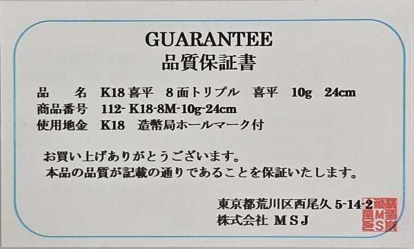 こちらは、純度の高い**K18(18金)ゴールド**を使用した、8面トリプルカットの喜平アンクレットです。