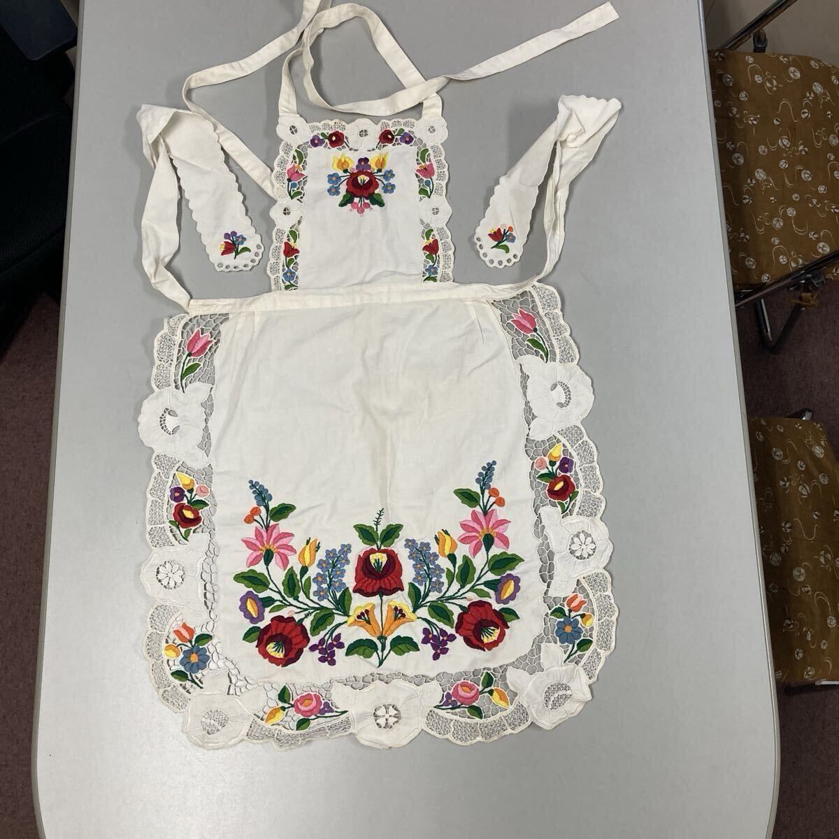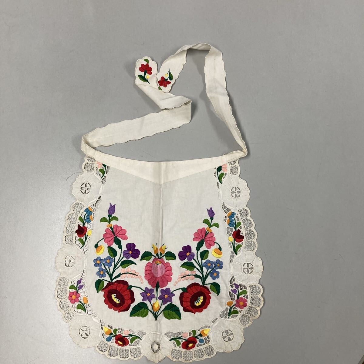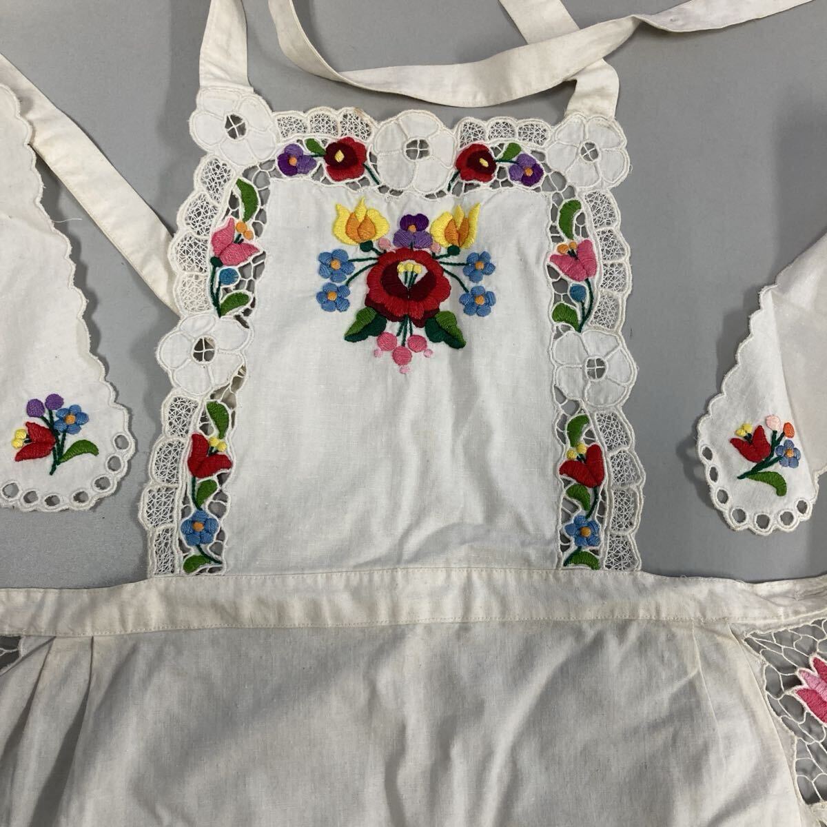 50年前にポーランドの現地で購入したポーランド刺繍のエプロン。日常では使用せずコレクションとして保管。少し紐のところに経年によるくすみがありますが全体として綺麗です。民芸的な作品です。刺繍も細かく繊細です。サイズ 丈 約73 横約 50センチ 紐で結ぶ方式。丈約 33 横35センチの2点セット
