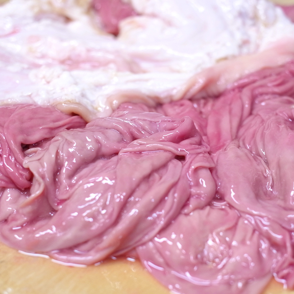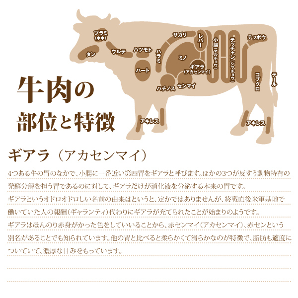 4つある牛の胃のなかで、小腸に一番近い第四胃をギアラと呼びます。ほかの3つが反すう動物特有の発酵分解を担う胃であるのに対して、ギアラだけが消化液を分泌する本来の胃です。 ギアラというオドロオドロしい名前の由来はというと、定かではありませんが、終戦直後米軍基地で働いていた人の報酬(ギャランティ)代わりにギアラが充てられたことが始まりのようです。 ギアラはほんのり赤身がかった色をしていいることから、赤センマイ(アカセンマイ)、赤センという別名があることでも知られています。他の胃と比べると柔らかくて滑らかなのが特徴で、脂肪も適度についていて、濃厚な甘みをもっています。 |