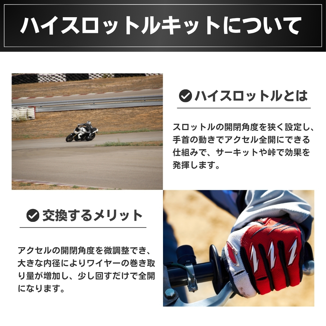 | 商品説明 | ご覧いただきありがとうございます! ●商品説明 KEIHIN OKO KOSOキャブレター用の汎用ハイスロットルキットセットです。 PZ19/20、PC19/20、PB16等のビッグキャブレターに適合します。 アクセルのストロークを短くすることで、アクセルを再握りすることなく全開にすることが可能。 手首の疲労を軽減し、全開で走ることが多い方やサーキット走行を楽しむ方に最適です。 取付に困らない「日本語取扱説明書」付きです☆ ●商品詳細 内容:グリップ(左×1個、右×1個) ホルダー×1個 アクセルワイヤー×1本(ワイヤー長さ:約1120mm) 内径(ハンドル径):22m カラー:ブラック/黒 重さ:約340グラム ●適合キャブレターについて ・PWK 28/33/35/38 ・OKO 21/24/28/30 ・KOSO 28/30/32/34 ・PZ19/PZ20/PC19/PC20/PB16 等 ●適合車種 モンキー/ゴリラ/エイプ/ゼファー/ダックス/シャリ― ATV/オフロードバイク/モトクロス ●お支払い方法 !かんたん決済 ●発送について 【ゆうパケットプラス便で発送します】 発送日 :お支払い後1~3日以内 到着目安:発送後2~4日程度 ※商品はポストに投函されます ※遠方の方はもう少しかかる場合もございます 【配送方法の変更はできません】 ●注意事項 ・商品画像の転載や説明文のコピーはお止め下さい 〇初期不良は対応しますので、何かあれば「受取評価前に」ご連絡下さい |