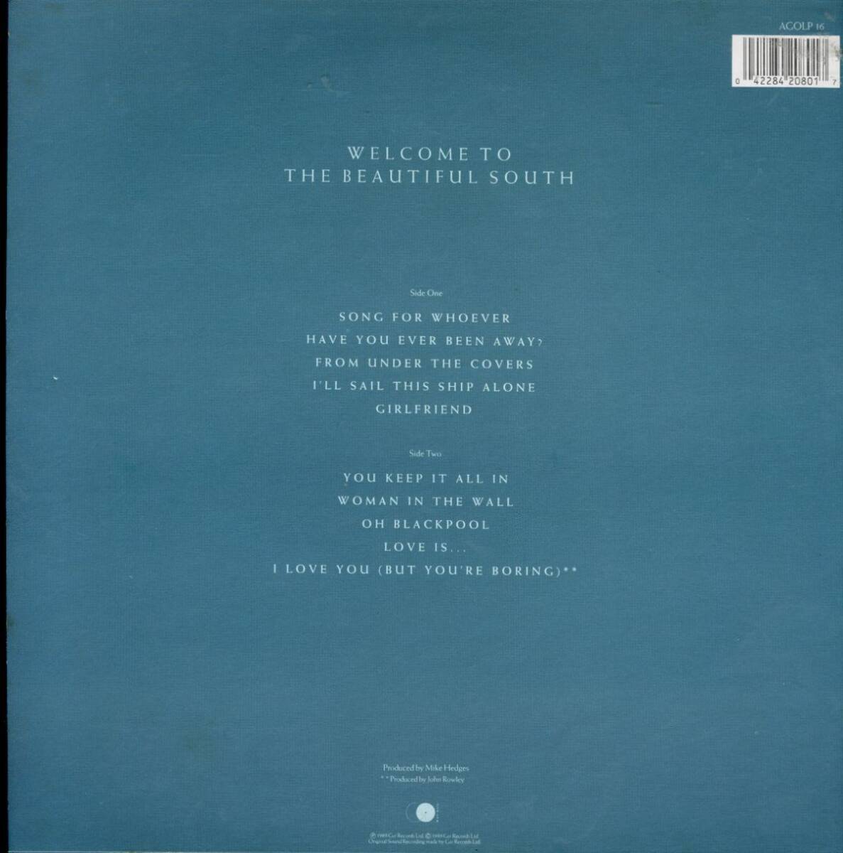 The Housemartins 解散後に中心人物であったポール・ヒートンが結成したバンド、The Beautiful Southの89年発表の1stアルバム。ヒット曲"Song For Whoever"、"You Keep It All In"等収録。//89年 UKプレス Go! Discs・インナースリーブ付(VPI cleaned)