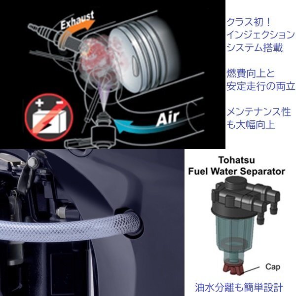 ・エンジン形式:4ストローク 2気筒 ・総排気量(mL):209 ・ボア×ストローク(mm):55×44 ・全開使用回転範囲(rpm):5,000-6,000 ・最大出力kW(PS):7.2(9.8) ・重量:42.0キロ ・冷却方式:水冷(サーモスタット付) ・始動方式:エレクトリックスタート ・燃料供給:電子式 ・ギア比:13:27 ・燃料:無鉛レギュラーガソリン ・ガソリンタンク容量(L) :12 付属 ・エンジンオイル容量(mL):800 ・ギアオイル容量(mL):320 ・他機能:警告装置 オーバーランニング防止システム/オイルプレッシャー警告 〇主要装備一覧〇 プロペラ、セルスタート、マニュアルティラーハンドル、12Lタンク ★コメント★ 新型の9.8馬力モデル クラス初の電子式インジェクション燃料噴射となり、始動性と燃費が大幅な向上 最大で35%もの燃費向上を実現! エンジン内部の洗浄もより簡易になりメンテナンス性も良く、油水分離も標準設定 水抜きもラクラク 12Lセパレートタンク付属 | ||||