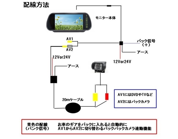 | 迅速・丁寧に出来る限りお客様に商品を早くお手元に届くように進めていきます。 どうぞ宜しくお願い致します。 ☆商品特徴☆ これ一台で、ギッシリ駐車場も楽々!!!バックオーライ!! もちろん、自動赤外線切り替え赤外線カメラなので非常に見づらい夜間でもよく見えます。 7インチサイズは大きくなく、小さすぎることなくちょうど良いサイズです。 特別オーダー品24V対応7インチミラーモニターを出品致します。 高級車によく使用される液晶同様!!!最高級日本製の高級ガラスを使用していますので、バックカメラの映像がよく見えます。 皆様、ご入札宜しくお願い致します。 ☆モニター商品詳細☆ ・7.0インチミラーモニター ・16:9、4:3の2パターン切り替え可能 ・カラー:NTSC&PAL(両対応自動切換え) ・解像度:480×234×RGBピクセル ・液晶パネル :TFT-LCD (日本製) ・液晶調整:カラー調整、ブライト調整、コントラスト調整、Tint調整 ・サイズ: 248mm(W)×105mm(H)×20mm(D) ・電源:DC24V/DC12V ・色:ブラック ・付属品:7.0インチモニター本体、電源ケーブル、リモコン、説明書 *リバース連動機能:モニター付属品のケーブルの青線をリバース検出(バックランプなど24Vあるいは12Vの発生する場所) に繋ぎ込むとリバースに入れると自動で、AV2に切り替わるシステムです。(バックカメラなどを付けるときに非常に便利な機能です。) ☆バックカメラ商品詳細☆ ・赤外線付き ・画素数:628XRGBX582=365496 ・画像:NTSC ・電源:DC24V/DC12V ・カメラ:防水機能付き ・サイズ:75(W)×50(H)×75(D)ミリ * 電源ケーブルとビデオケーブルが、一緒になっているので、カメラ本体とケーブルを繋げるだけで余分に電源ケーブルを取り付ける手間が省けるので、楽々取り付け出来ます。 *36万画素高画質自動赤外線切り替え赤外線カメラは、映像が良く見える最新型です。 *カメラ付属品: 赤外線カメラ、20m電源映像延長ケーブル、ネジ ☆取り付け注意事項☆ ・お取り付けの電気ショートは、十分に注意お願い致します。 ・此方の商品は、DC24Vです。(DC12Vでも使用可能) ・機器破損の原因になりますので、分解はしないでください。 (分解による機器破損及び商品の改造・加工は、交換対象外になります。) |