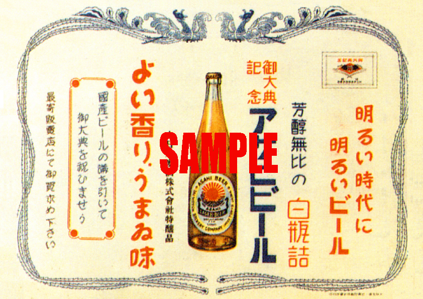 )のアサヒビールの広告のレプリカ(複製品)です。 実際の商品には「SAMPLE」の文字はありませんし、画質も上質です。 材質は厚手の高品位マット紙、大きさはA4サイズ、ラミネート加工がしてあります。お手軽な価格でレトロな雰囲気を演出します。店舗のディスプレイや、お部屋、ガレージなどにいかがでしょうか? 額縁に入れても素敵です。 |