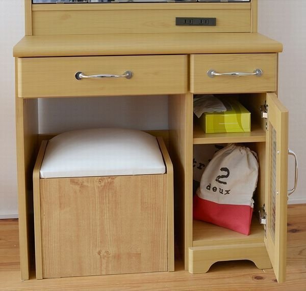 | スタンダードなカラーでシンプルな三面鏡ドレッサー。 お得なセットのスツールは座面の中に収納可能なスペース付。 広めの引出しと、小さめの引出し、背の高いものも収納できるガラス扉収納スペースもあり、 ミラーの裏側にも収納できるので、メイクアップに必要なものを大量収納できます。 2口コンセント付きなので、ドライヤーやヘアアイロンもドレッサー周りでご使用いただけます。 |